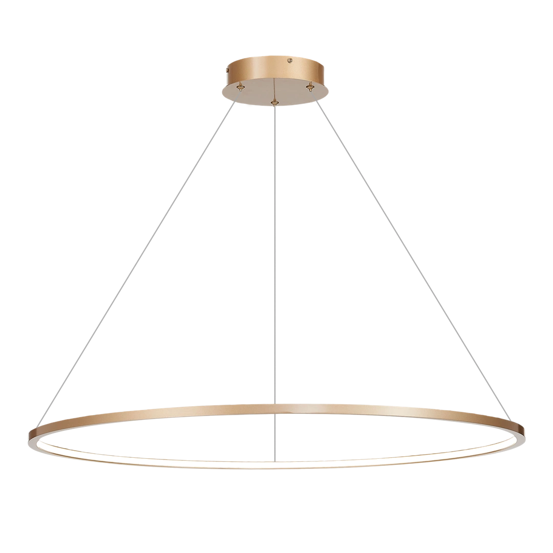 SATURNO ML8863 to stylowa lampa wisząca z jednym źródłem światła. Lampa składa się z aluminiowego złotego pierścienia zwisającego z okrągłej rozety na stalowych linkach. Źródło światła znajduje się pod mlecznym paskiem z tworzywa. Oprawa będzie idealnym wyborem do wnętrz urządzonych w nowoczesnym stylu. Doskonale będzie się prezentować w: salonie, jadalni, sypialni, pokoju młodzieżowym, gabinecie, biurze, lokalu, przedpokoju, kuchni, łazience. Dużą zaletą jest możliwość regulacji wysokości. Wysokość maksymalna lampy to: 100 cm, szerokość 100 cm, głębokość 100 cm. Źródłem światła jest zintegrowany LED o mocy 57W, neutralnej barwie 4000K i jasności 3100lm.