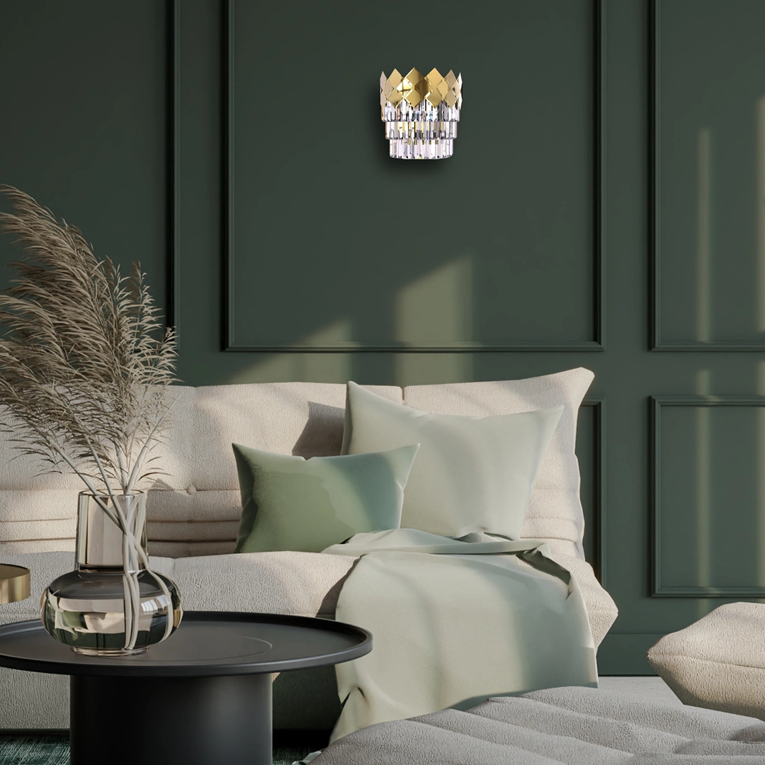 CARISMA ML8890 to bardzo elegancka lampa ścienna z dwoma źródłami światła. Wykonana została z wysokiej jakości metalu w kolorze złotym oraz zwisających kaskadowo kryształów, które efektownie odbijają światło. Bardzo elegancki wygląd sprawia, że lampa będzie idealnym wyborem do wnętrz nowoczesnych, klasycznych oraz glamour. Doskonale wkomponuje się do: salonu, sypialni, jadalni, lokalu, przedpokoju, korytarza. Kinkiet ma wysokość 34 cm, szerokość 27 cm, głębokość 16 cm. Źródłem światła jest żarówka typu E14 o mocy max 40W w ilości 2 szt.