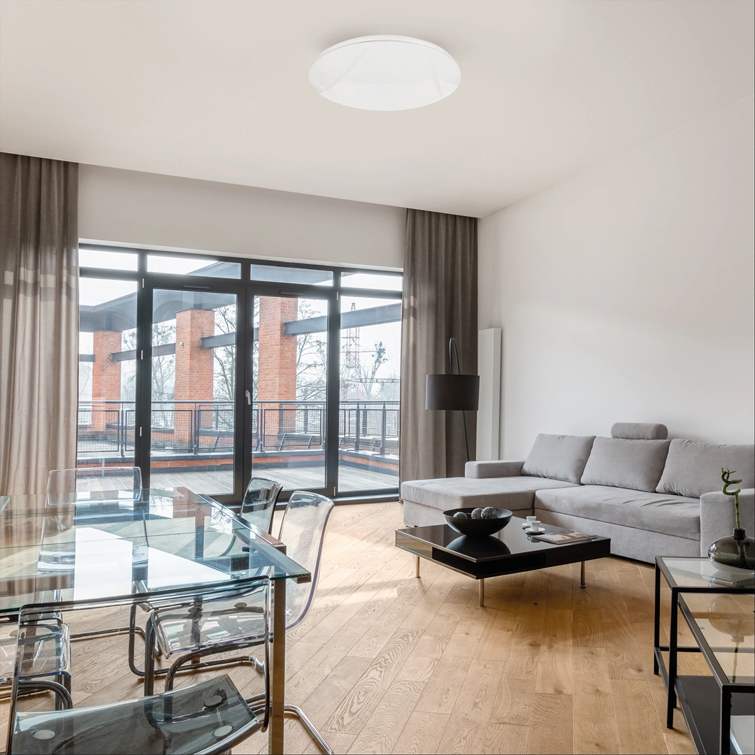 ALLISTER ML8232 to nowoczesna lampa sufitowa z jednym źródłem światła, która doskonale będzie się prezentować w każdym pomieszczeniu. Lampa ma kształt klasycznego spodku, wykonana została z wysokiej jakości metalu i tworzywa sztucznego w kolorze białym. Do plafonu dołączony jest pilot za pomocą którego można między innymi regulować natężenie i barwę światła. Lampa ma wysokość 6 cm i średnicę 48 cm. Źródłem światła jest zintegrowany LED o mocy 50W, zmiennej barwie światła 3000K-6000K i jasności 5600lm.