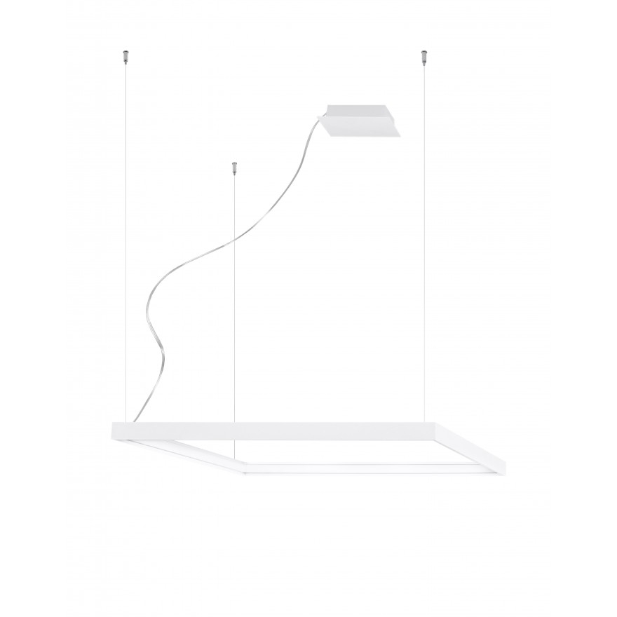 NELYA TH.150 to stylowa lampa wisząca z jednym źródłem światła. Lampa ma kształt kwadratowej ramki, wykonana została z aluminium w kolorze białym. Źródło światła znajduje się pod mleczną osłoną z akrylu. Całość zwisa na stalowych linkach. Bardzo elegancki wygląd sprawia, że lampa będzie idealnym wyborem do wnętrz nowoczesnych, minimalistycznych oraz skandynawskich. Doskonale sprawdzi się w przestrzeniach mieszkalnych oraz komercyjnych. Wysokość lampy to: 150 cm, szerokość 80 cm, długość 80 cm. Źródłem światła jest zintegrowany LED o mocy 50W, neutralnej barwie 4000K i jasności 5757lm
