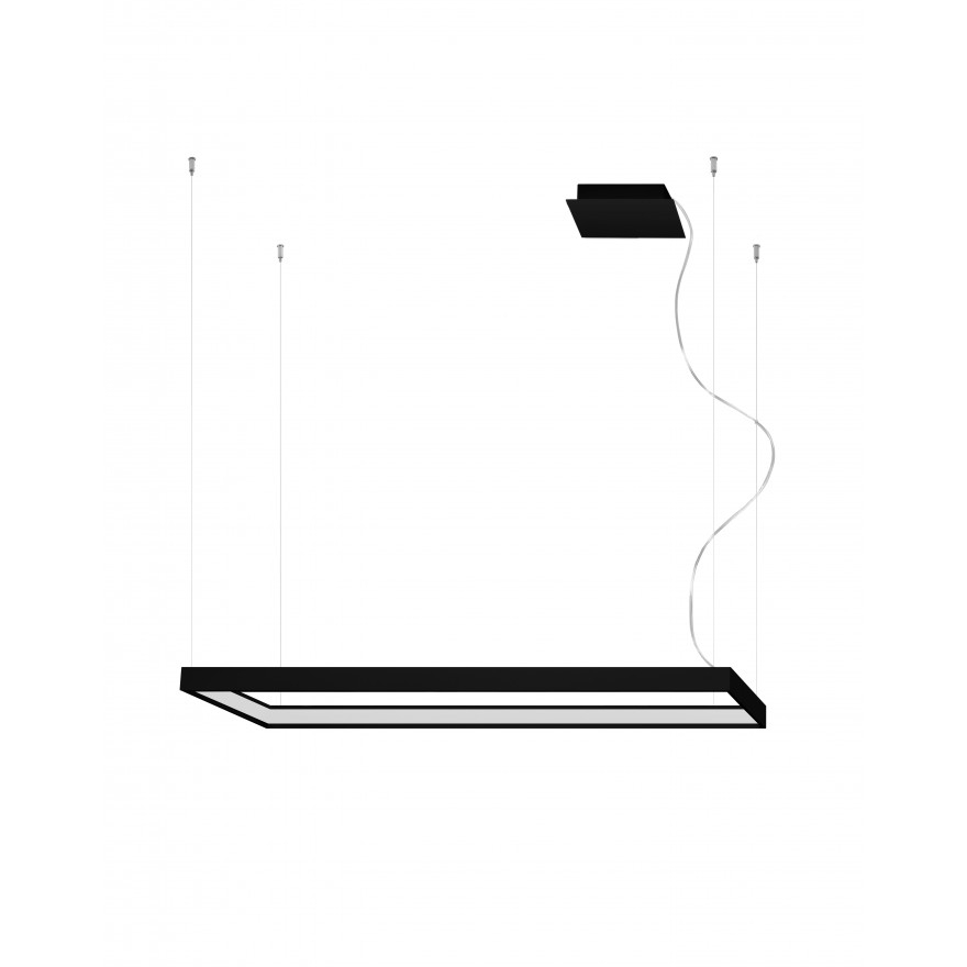 TUULA TH.163 to stylowa lampa wisząca z jednym źródłem światła. Lampa ma kształt prostokątnej ramki, wykonana została z aluminium w kolorze czarnym. Źródło światła znajduje się pod mleczną osłoną z akrylu. Całość zwisa na stalowych linkach. Bardzo elegancki wygląd sprawia, że lampa będzie idealnym wyborem do wnętrz nowoczesnych, minimalistycznych oraz skandynawskich. Doskonale sprawdzi się w przestrzeniach mieszkalnych oraz komercyjnych. Wysokość lampy to: 150 cm, szerokość 30 cm, długość 100 cm. Źródłem światła jest zintegrowany LED o mocy 50W, neutralnej barwie 4000K i jasności 5757lm