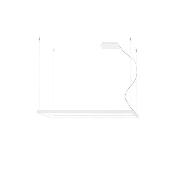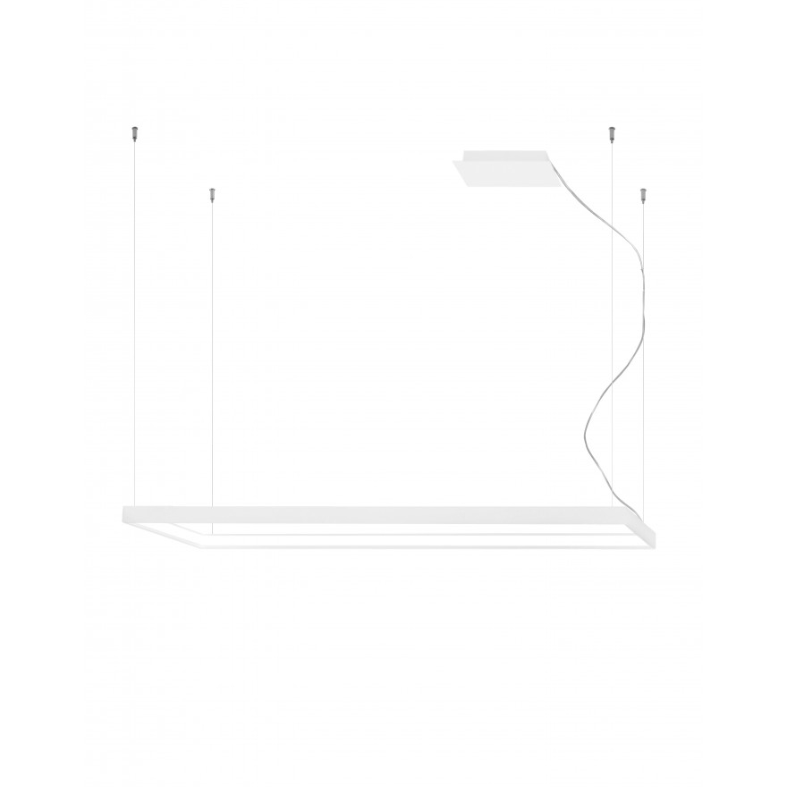 TUULA TH.165 to stylowa lampa wisząca z jednym źródłem światła. Lampa ma kształt prostokątnej ramki, wykonana została z aluminium w kolorze białym. Źródło światła znajduje się pod mleczną osłoną z akrylu. Całość zwisa na stalowych linkach. Bardzo elegancki wygląd sprawia, że lampa będzie idealnym wyborem do wnętrz nowoczesnych, minimalistycznych oraz skandynawskich. Doskonale sprawdzi się w przestrzeniach mieszkalnych oraz komercyjnych. Wysokość lampy to: 150 cm, szerokość 40 cm, długość 130 cm. Źródłem światła jest zintegrowany LED o mocy 50W, ciepłej barwie 3000K i jasności 5751lm
