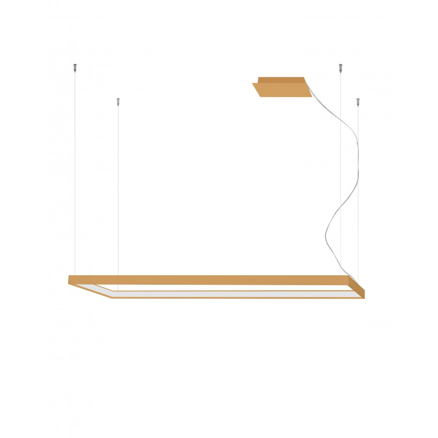 TUULA TH.167 to stylowa lampa wisząca z jednym źródłem światła. Lampa ma kształt prostokątnej ramki, wykonana została z aluminium w kolorze złotym. Źródło światła znajduje się pod mleczną osłoną z akrylu. Całość zwisa na stalowych linkach. Bardzo elegancki wygląd sprawia, że lampa będzie idealnym wyborem do wnętrz nowoczesnych, minimalistycznych oraz skandynawskich. Doskonale sprawdzi się w przestrzeniach mieszkalnych oraz komercyjnych. Wysokość lampy to: 150 cm, szerokość 40 cm, długość 130 cm. Źródłem światła jest zintegrowany LED o mocy 50W, ciepłej barwie 3000K i jasności 5751lm
