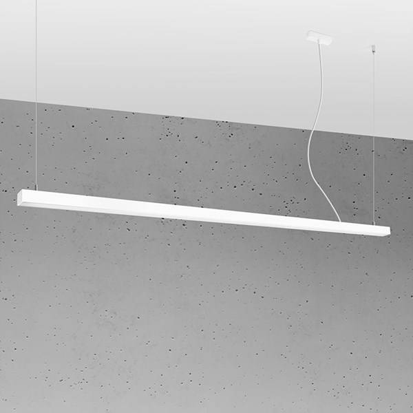 PINNE TH.231 to nowoczesna lampa wisząca z jednym źródłem światła. Lampa ma kształt prostokątnej belki, jest wykonana z aluminium w kolorze białym. Źródło światła znajduje się pod mleczną osłoną z tworzywa. Całość zwisa na stalowych linkach. Bardzo elegancki wygląd sprawia, że lampa będzie idealnym wyborem do wnętrz nowoczesnych, minimalistycznych oraz modernistycznych. Doskonale sprawdzi się w przestrzeniach mieszkalnych oraz komercyjnych. Dużą zaletą jest możliwość regulacji wysokości. Wysokość maksymalna lampy to: 150 cm, szerokość 6 cm, długość 200 cm. Źródłem światła jest wbudowany moduł LED o mocy 50W, neutralnej barwie 4000K i jasności 6500 lm.