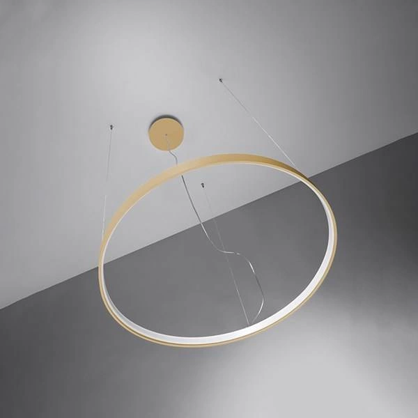 RIO TH.219 to stylowa lampa wisząca z jednym źródłem światła. Wykonana została z aluminium w kolorze złotym. Źródło światła znajduje się pod białą osłoną z tworzywa. Oprawa będzie idealnym wyborem do wnętrz urządzonych w nowoczesnym stylu. Doskonale będzie się prezentować w: salonie, jadalni, sypialni, pokoju młodzieżowym, gabinecie, biurze, lokalu, kuchni, łazience. Dużą zaletą jest możliwość regulacji wysokości. Wysokość maksymalna lampy to: 150 cm, szerokość 110 cm, długość 110 cm. Źródłem światła jest zintegrowany LED o mocy 70W, neutralnej barwie 4000K i jasności 7820lm