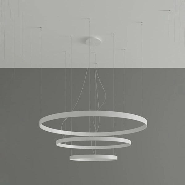 RIO TH.215 to stylowa lampa wisząca ze zintegrowanym źródłem światła. Wykonana została z wysokiej jakości metalu w kolorze białym. Elementami wyróżniającymi lampy są trzy klosze w kształcie pierścieni zawieszone na stalowych linkach. Źródła światła znajdują się pod mlecznymi osłonami z tworzywa. Oprawa będzie idealnym wyborem do wnętrz urządzonych w nowoczesnym stylu. Doskonale będzie się prezentować w: salonie, jadalni, sypialni, pokoju młodzieżowym, gabinecie, biurze, lokalu, kuchni, łazience. Dużą zaletą jest możliwość regulacji wysokości. Wysokość maksymalna lampy to: 150 cm, szerokość 110 cm, długość 110 cm. Źródłem światła jest niewymienny moduł LED o mocy 150W, ciepłej barwie 3000K i jasności 17210lm