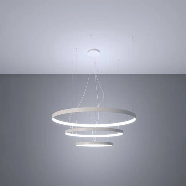 RIO TH.271 to stylowa lampa wisząca ze zintegrowanym źródłem światła. Wykonana została z wysokiej jakości metalu w kolorze białym. Elementami wyróżniającymi lampy są trzy klosze w kształcie pierścieni zawieszone na stalowych linkach. Źródła światła znajdują się pod mlecznymi osłonami z tworzywa. Oprawa będzie idealnym wyborem do wnętrz urządzonych w nowoczesnym stylu. Doskonale będzie się prezentować w: salonie, jadalni, sypialni, pokoju młodzieżowym, gabinecie, biurze, lokalu, kuchni, łazience. Dużą zaletą jest możliwość regulacji wysokości. Wysokość maksymalna lampy to: 150 cm, szerokość 110 cm, długość 110 cm. Źródłem światła jest niewymienny moduł LED o mocy 150W, neutralnej barwie 4000K i jasności 17210lm