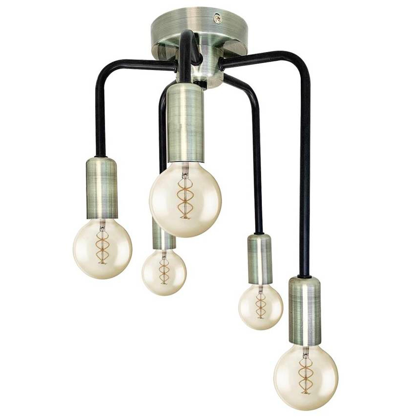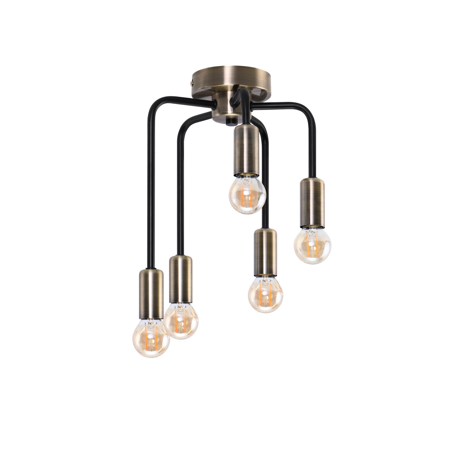 SAGA 35-01337 to stylowa lampa sufitowa z pięcioma źródłami światła. Wykonana została z wysokiej jakości metalu w kolorze patynowym z czarnymi detalami. Lampa nie posiada kloszy co sprawia że odsłonięte żarówki są elementami ozdobnymi dlatego warto wybrać ich dekoracyjny model. Oprawa będzie idealnym wyborem do wnętrz urządzonych w stylu minimalistycznym, industrialnym oraz loftowym. Doskonale będzie się prezentować w: salonie, jadalni, sypialni, pokoju młodzieżowym, gabinecie, lokalu, kuchni. Wysokość lampy to: 35 cm, szerokość 25,5 cm, głębokość 25,5 cm. Źródłem światła jest żarówka typu E14 o mocy max 40W w ilości 5 szt.
