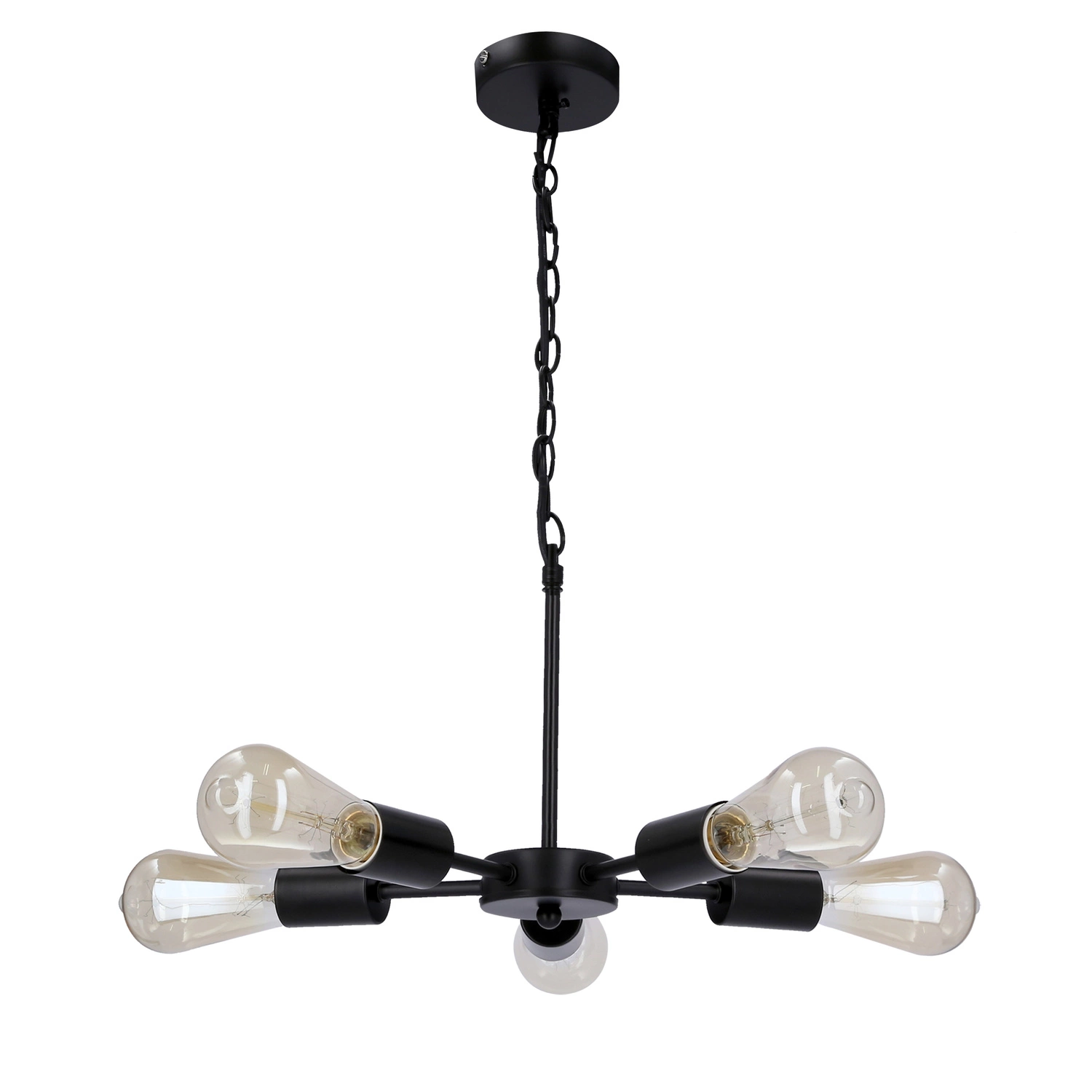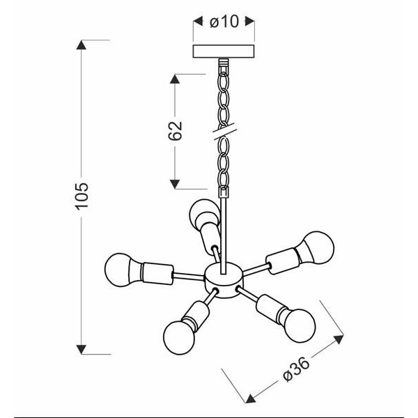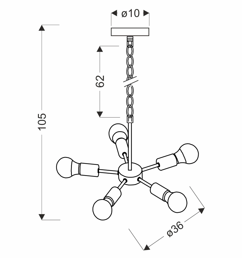 SPARTA 35-09388 to stylowa lampa wisząca z pięcioma źródłami światła. Wykonana została z wysokiej jakości stali w kolorze czarnym. Oprawa nie posiada kloszy co sprawia że odsłonięte żarówki są elementami ozdobnymi dlatego warto wybrać ich dekoracyjny model. Lampa będzie idealnym wyborem do wnętrz urządzonych w stylu nowoczesnym, industrialnym oraz loftowym. Doskonale będzie się prezentować w: salonie, jadalni, sypialni, pokoju młodzieżowym, gabinecie, lokalu, kuchni. Dużym atutem jest możliwość regulacji wysokości. Wysokość maksymalna lampy to: 105 cm, średnica 36 cm. Źródłem światła jest żarówka typu E27 o mocy max 60W w ilości 5 szt.
