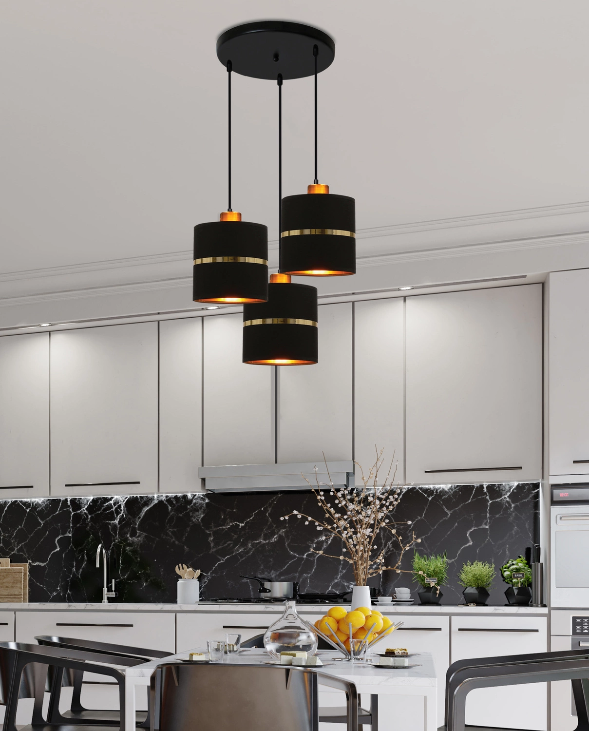 ASSAM 33-17468 to stylowa lampa wisząca z trzema źródłami światła. Zawiesie lampy wykonano z wysokiej jakości stali w kolorze czarno-złotym, abażury są z czarnej tkaniny ze złotym paskiem i złotym wnętrzem. Oprawa będzie idealnym wyborem do wnętrz urządzonych w stylu klasycznym oraz nowoczesnym. Doskonale będzie się prezentować w: salonie, jadalni, sypialni, pokoju młodzieżowym, gabinecie, lokalu, kuchni. Dużym atutem jest możliwość regulacji wysokości. Wysokość maksymalna lampy to: 90 cm, szerokość 40 cm, głębokość 40 cm. Źródłem światła jest żarówka typu E27 o mocy max 60W w ilości 3 szt.