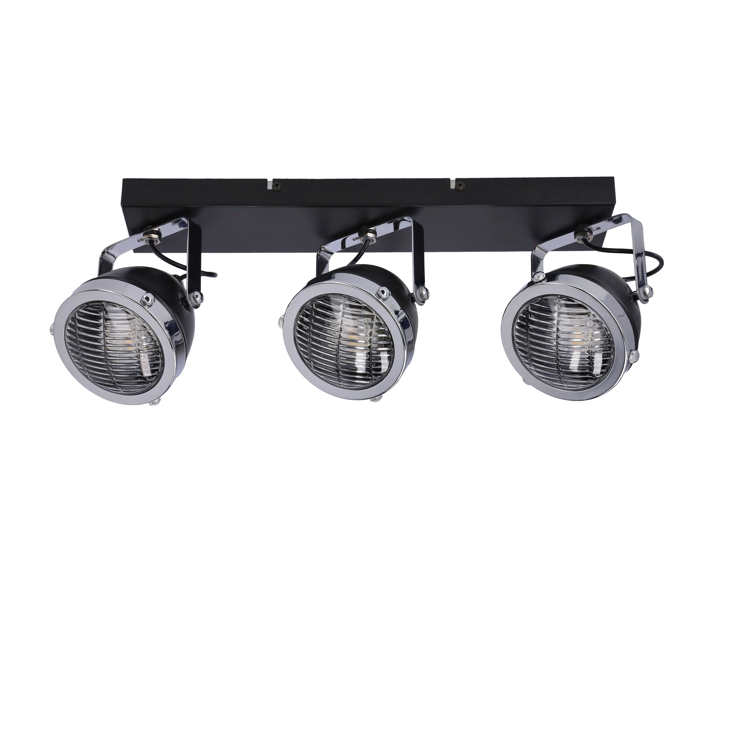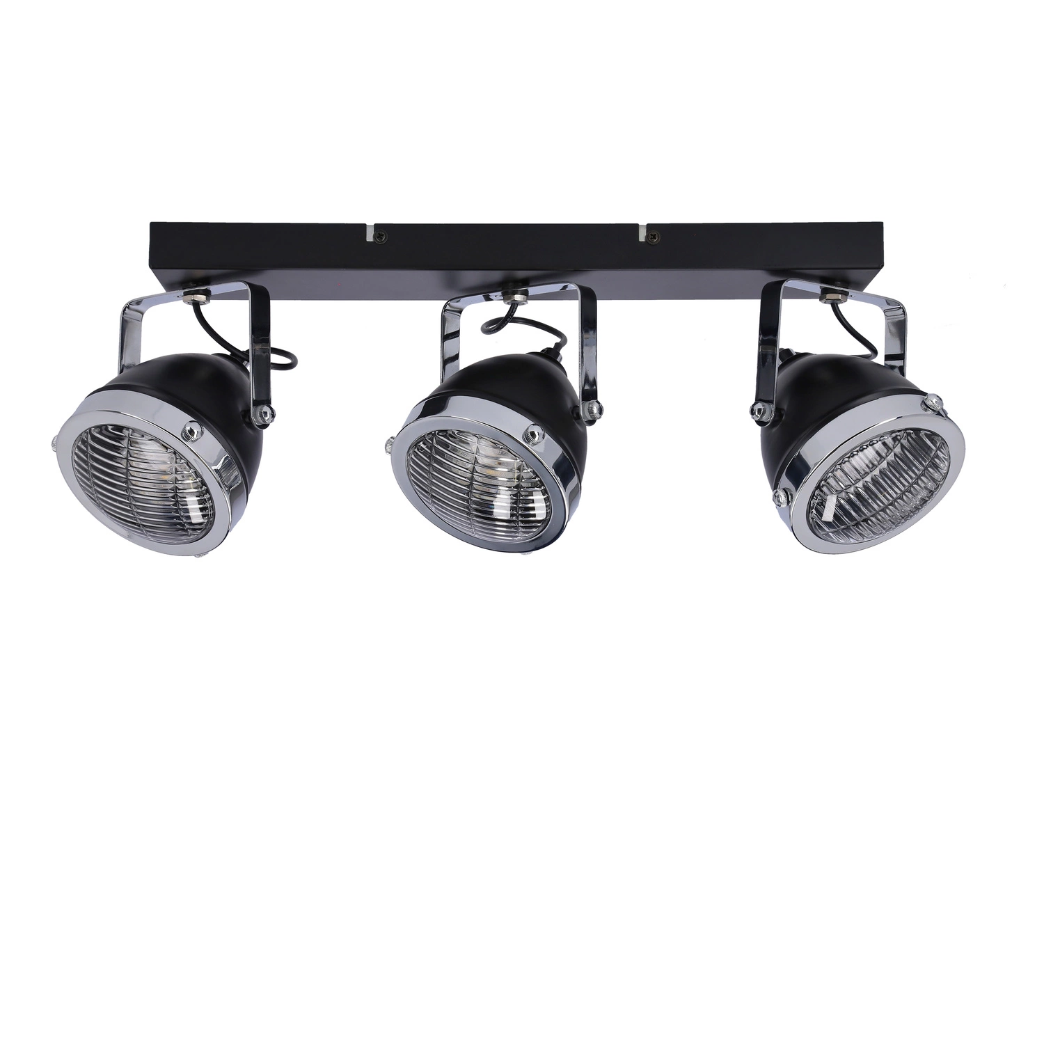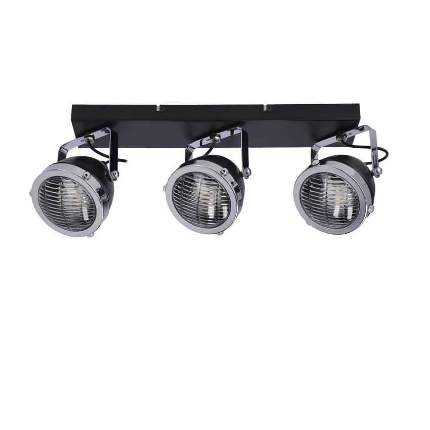 CRAZY 93-13316 to stylowa lampa sufitowa z trzema źródłami światła. Korpus lampy wykonano z wysokiej jakości stali w kolorze czarnym z chromowymi detalami, klosze są z transparentnego szkła. Każdy z kloszy ma możliwość regulacji kierunku padania światła. Oprawa będzie idealnym wyborem do wnętrz urządzonych w klasycznym oraz retro. Doskonale będzie się prezentować w: salonie, jadalni, sypialni, pokoju młodzieżowym, gabinecie, lokalu, kuchni. Wysokość lampy to: 17 cm, szerokość 41 cm, głębokość 11 cm. Źródłem światła jest żarówka typu GU10 o mocy max 15W w ilości 3 szt.