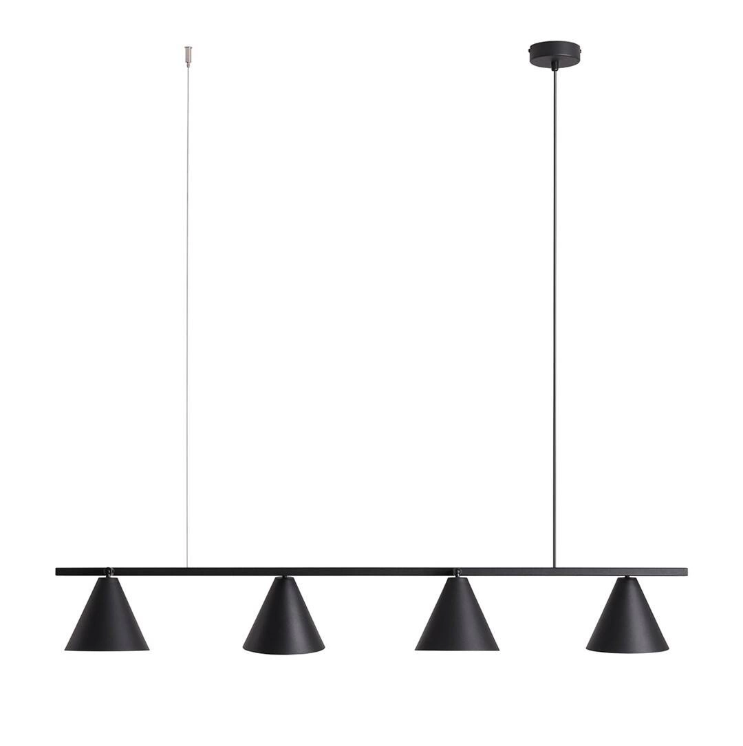 Lampa wisząca Form 4 BLACK to model z czterema kloszami w kształcie stożka, w kolorze czarnym, o satynowej powłoce. Doskonale sprawdzi się do oświetlenia przestrzeni nad stołem w Twoim salonie, kuchni, a nawet jadalni. O niepowszednim zastosowaniu lampy mogą świadczyć klosze regulowane na przegubach. Całość stanowi konstrukcję z metalu, co przekłada się na wyjątkową