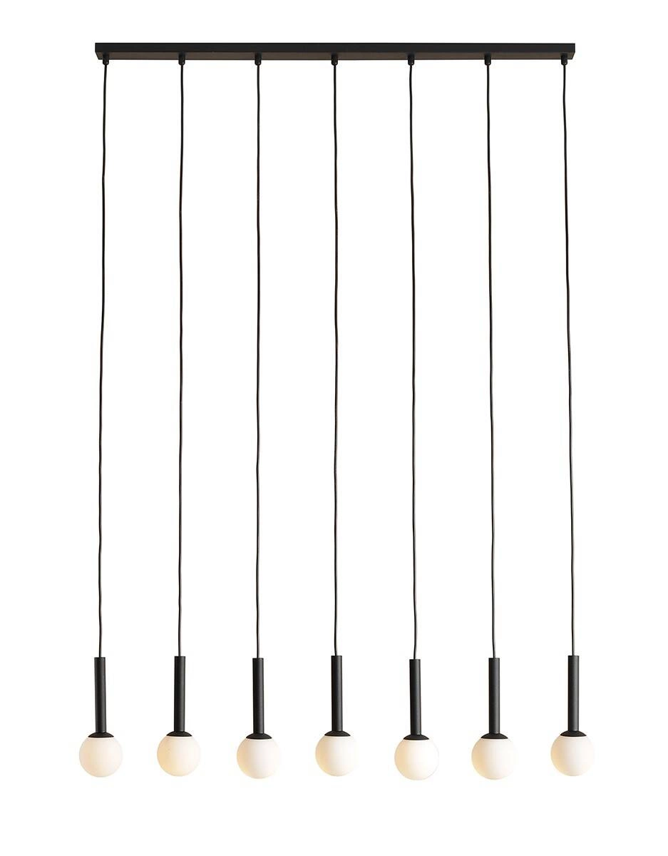 Elegancka i innowacyjna lampa wisząca RIU 7 ALL Black to klasyczna postać, która zyskała wiele uroku za kwestią siedmiu, niewielkich rozmiarów matowych kloszy, osadzonych na czarnych ramionach. Długie przewody z kloszami, które można skrócić i dostosować lampę do własnej aranżacji, zwieszone są na listwie. Model ten czarująco zaprezentuje się nie tylko w salonie czy nad stołem gościnnym w jadalni Twojego domu, ale także w biurze czy sali konferencyjnej. Spektakularnie oświetli także hole i wnętrza użyteczności publicznej.