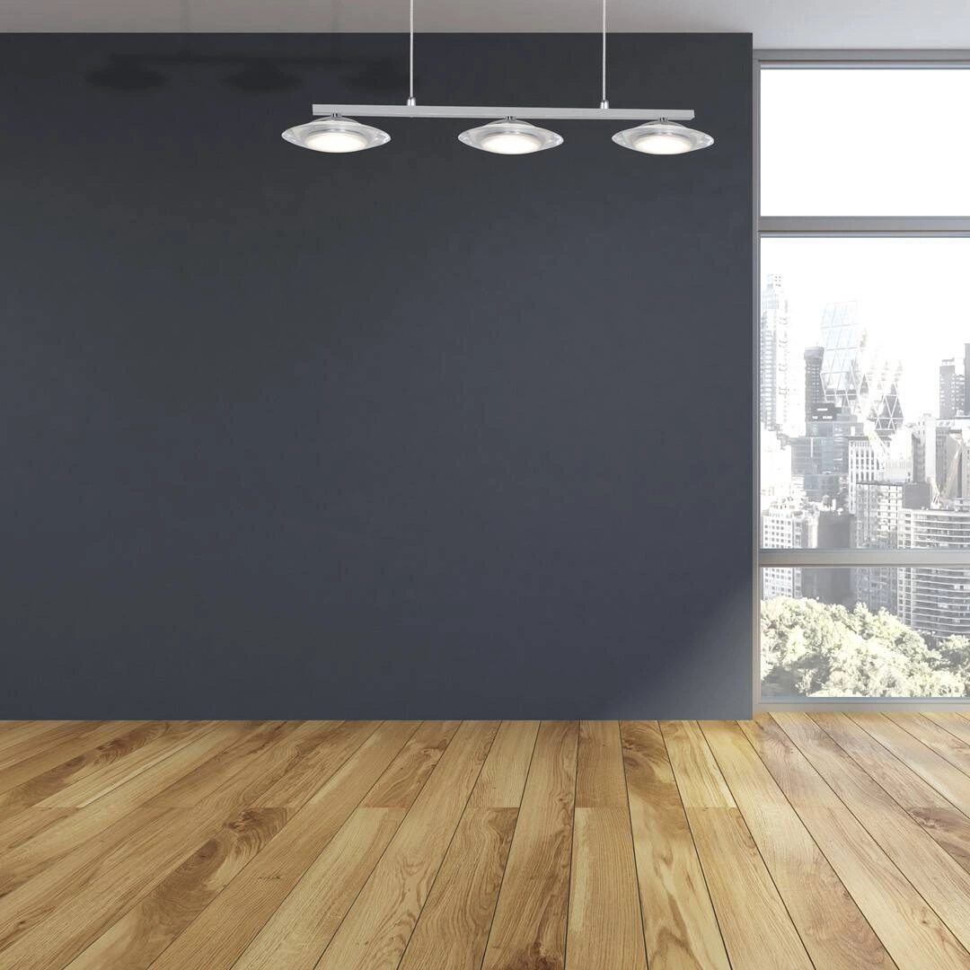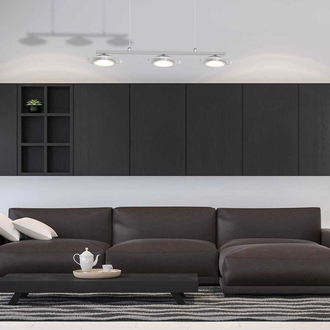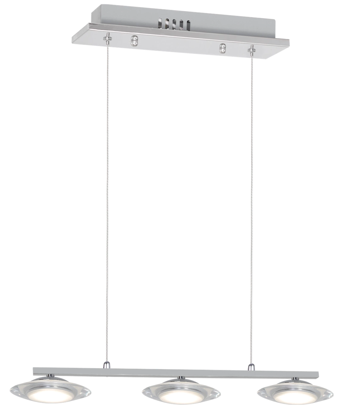 "Prezentowana lampa z serii Ellipse posiada miejsce na trzy źródła światła, a jej wysokość można regulować na przewodzie od 40 do 100 cm, dzięki czemu można dopasować ją do różnego typu pomieszczeń. Wyposażona w zainstalowane na stałe moduły LED o mocy 15 W, które odpowiadają 79 W tradycyjnej żarówki. Strumień świetlny na poziomie 1120 lm gwarantuje bardzo dobre oświetlenie nawet dużych pomieszczeń. Produkt został wykonany z metalu oraz akrylu w kolorze chromowanym.