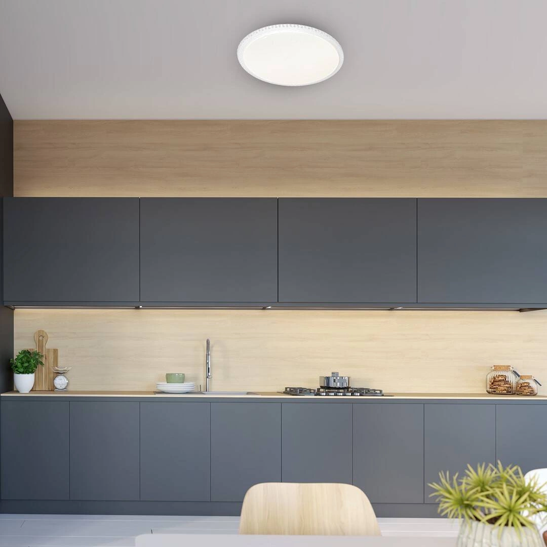Lampy sufitowe CRUZ wykonane sę z bezpiecznego i trwałego tworzywa sztucznego. Natężenie światła regulowane jest przy pomocy pilota, którym można również zmieniać barwę światła pomiędzy 3000K, 4000K i 6000K.