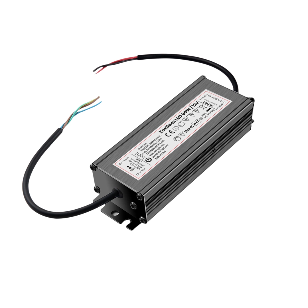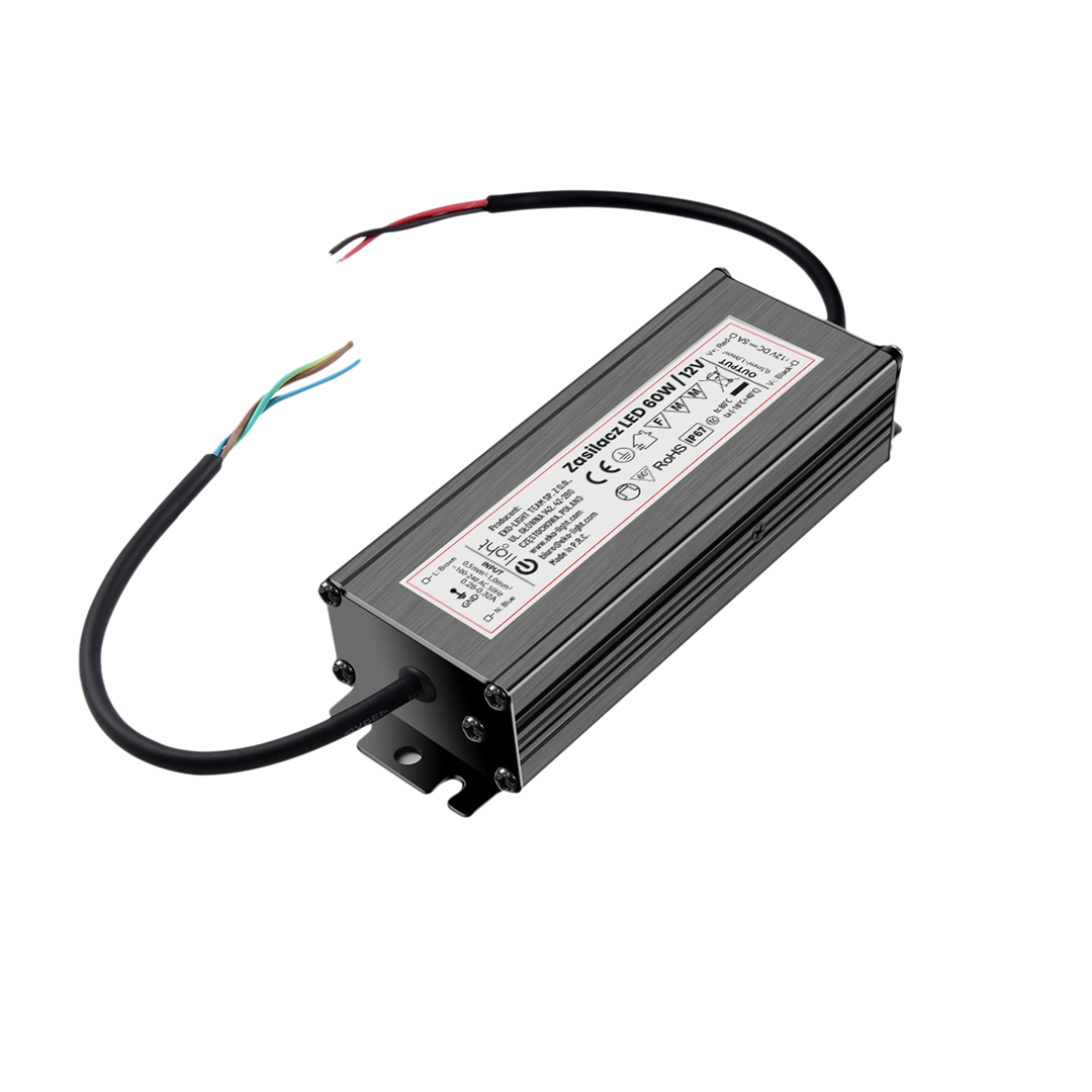 o mocy 60 W w obudowie metalowej o zminiaturyzowanej konstrukcji, która umożliwia prawidłowe chłodzenie oraz zabezpieczenie przed porażeniem. Zasilacz posiada stopień ochrony IP67. Przeznaczony jest do zasilania taśm LED, modułów, paneli, listew, żarówek LED oraz wielu innych urządzeń elektronicznych zasilanych napięciem stałym 12V DC.