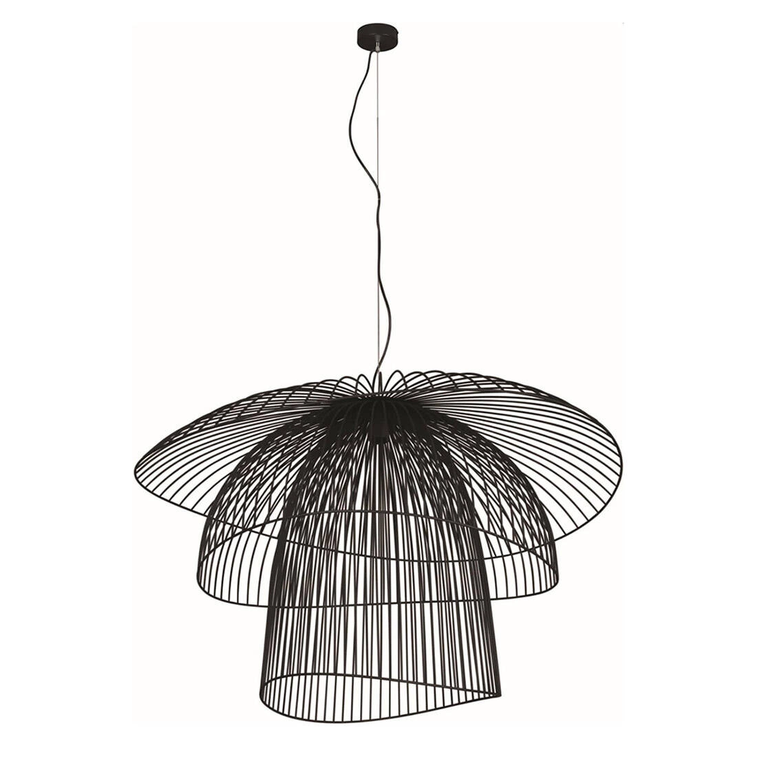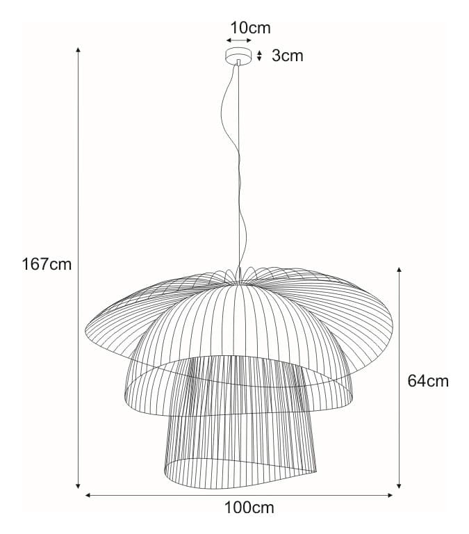 Żyrandol prezentuje się naprawdę okazale. Na jego konstrukcję składają się trzy klosze zespawanych ze sobą prętów. Zostały one nałożone na siebie w taki sposób, że tworzą przestrzenny kształt przypominający uproszczony schemat kielicha kwiatu skierowanego w dół.