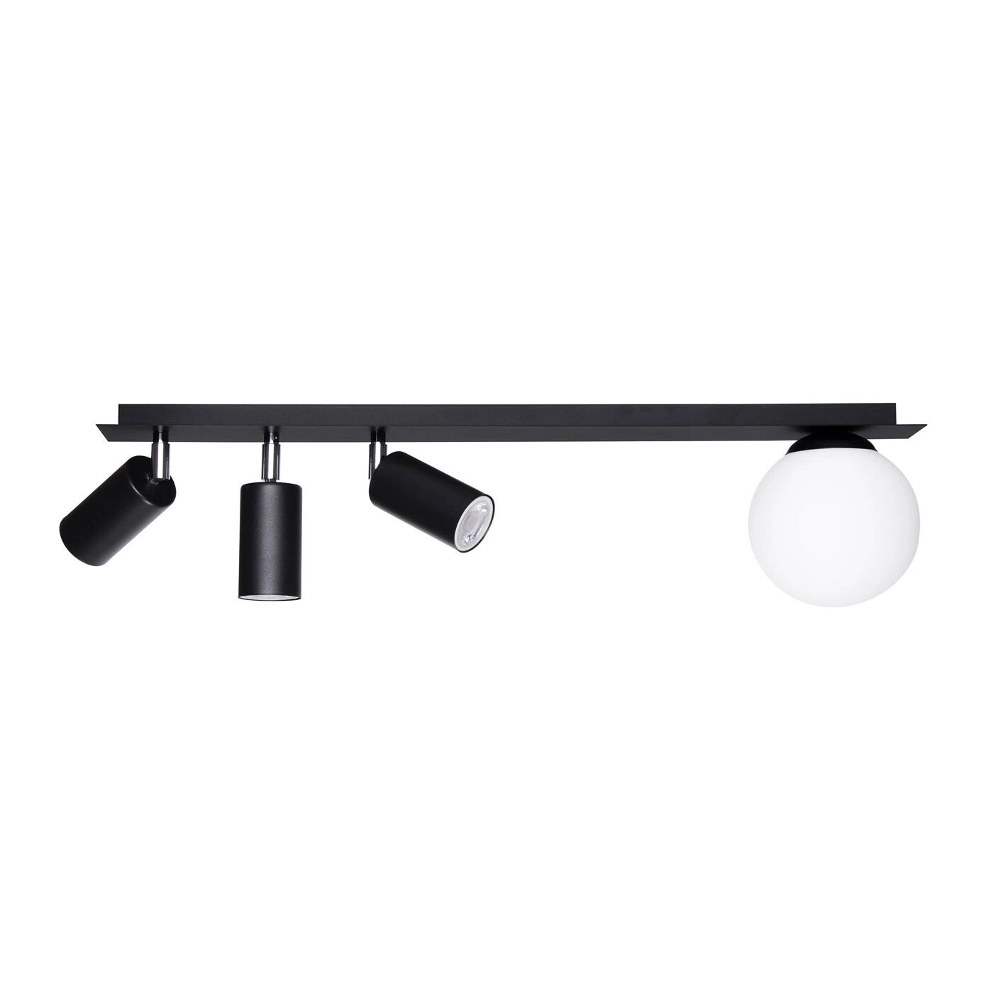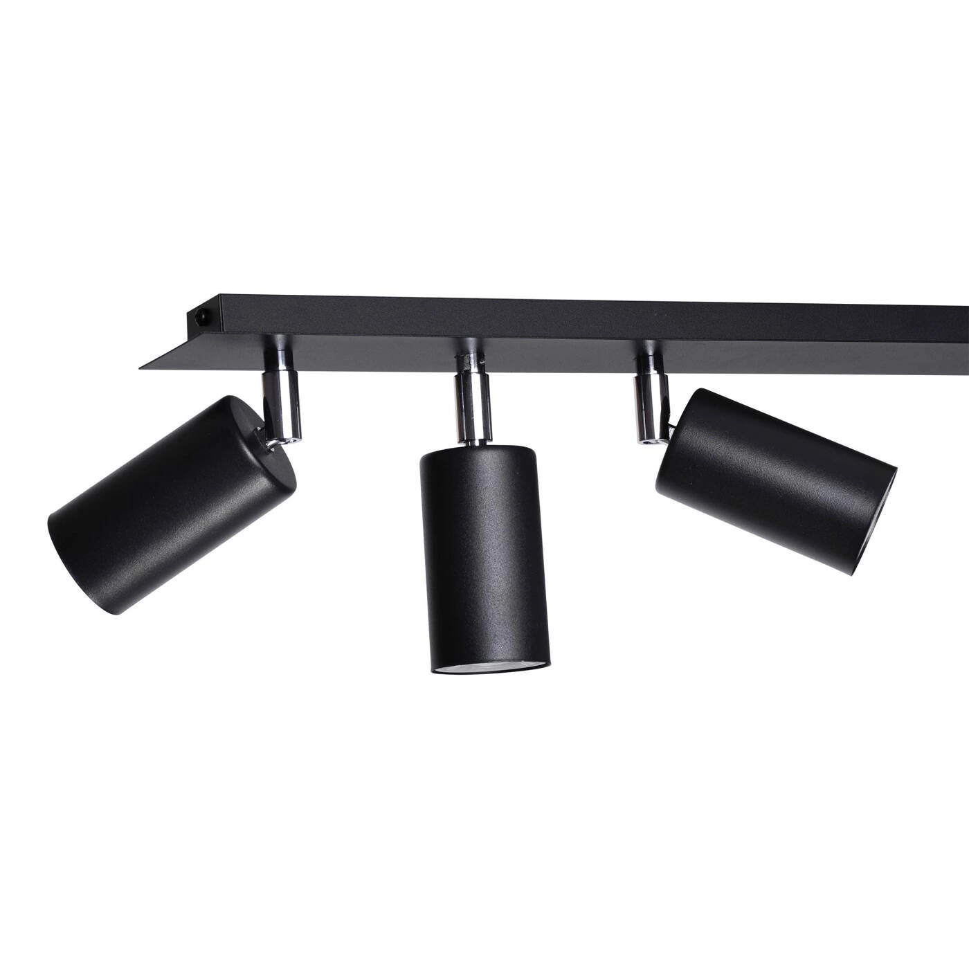 Cztery punkty światła umieściliśmy na dwóch końcach podłużnej podsufitki. Po jednej stronie mamy trzy reflektory z gwintem GU10, a po drugiej klosz z trzonkiem E14. Lampa posiada możliwość podziału na dwa włączniki (3+1).