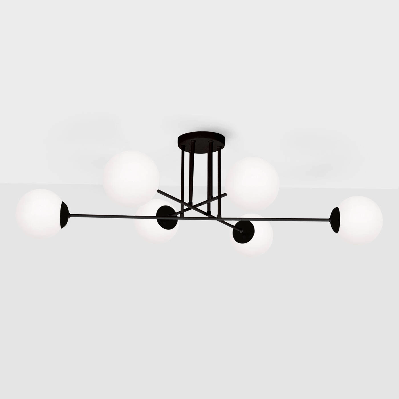 Na lampę sufitową K-4925 składa się aż sześć kulistych kloszy umieszczonych na końcach skrzyżowanych ze sobą metalowych prętów. Cała konstrukcja mierzy 100 cm szerokości i 28 cm wysokości. Produkt sprawdzi się jako główne oświetlenie pomieszczeń o większym metrażu. Dzięki niedużej odległości od sufitu będzie dobrym pomysłem do niskich pokoi, gdzie nie możemy sobie pozwolić na zwisające żyrandole.