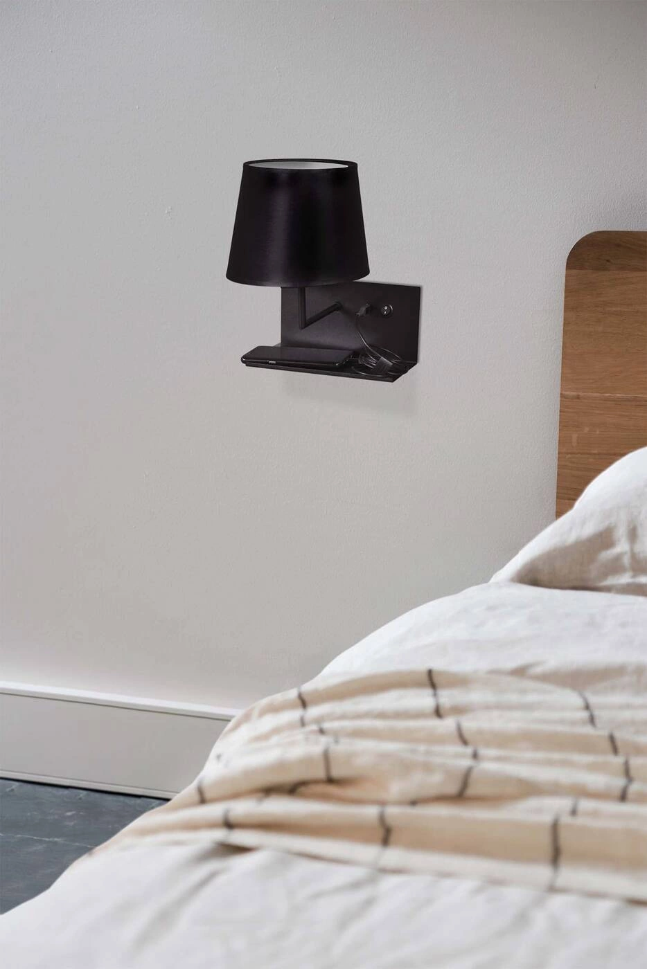 Do stworzenia konstrukcji wykorzystano najwyższej jakości materiały, które wyróżniają się niezwykłą trwałością. Czarny, metalowy element uformowano na kształt małej półeczki, do której przymocowano elegancki klosz obleczony materiałem z tworzywa sztucznego. Na części styku ze ścianą umieszczono wygodny, nierzucający się w oczy włącznik, a obok niego port USB. Całość została zachowana w kolorze głębokiej czerni, która dodaje elegancji i klasy.