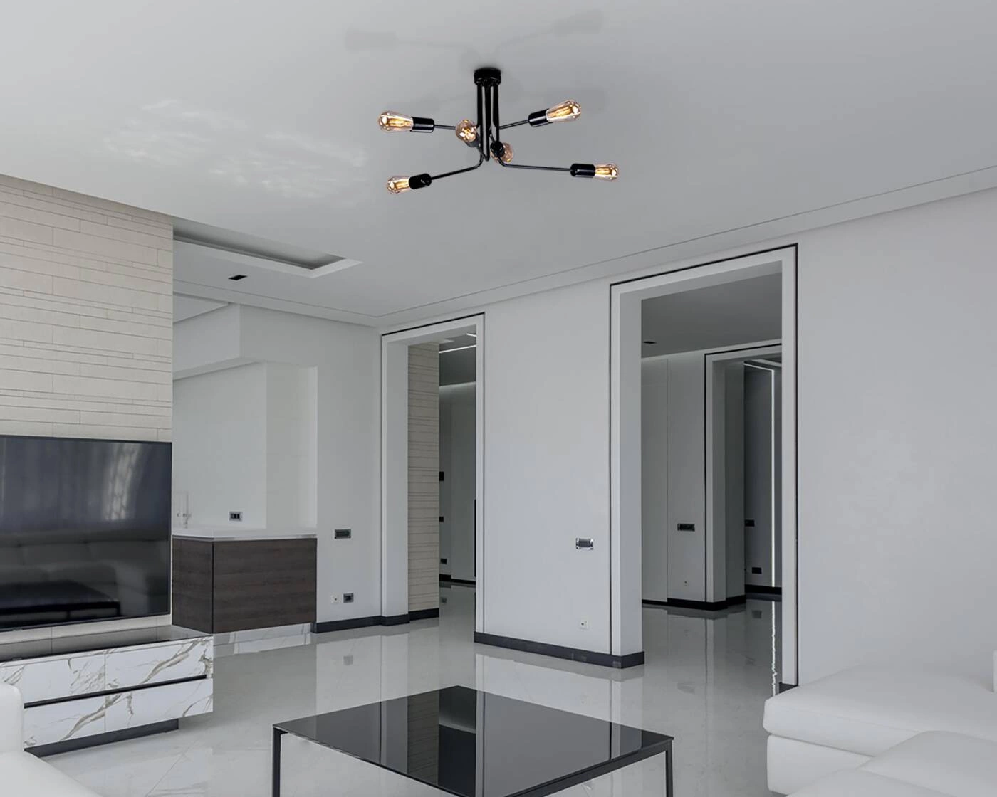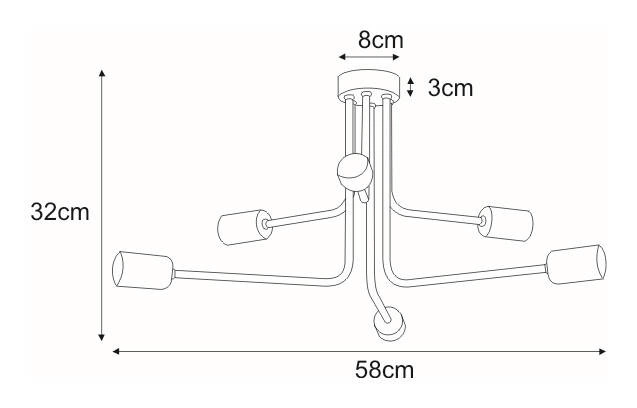 Lampa sufitowa K-3891 została stworzona z najwyższej jakości metalu, dzięki czemu posłuży nam na lata użytkowania. Sześć prętów wychodzi z okrągłej podsufitki w dół, a następnie wygina się na różne strony i kierując punkty światła na boki pomieszczenia. Trzy dłuższe pręty spoczywają niżej, a trzy krótsze wyżej. Cała konstrukcja mierzy 32 cm wysokości oraz 58 cm szerokości. Takimi wymiarami idealnie wpasuje się w każde pomieszczenie i skomponuje się z jego aranżacją.