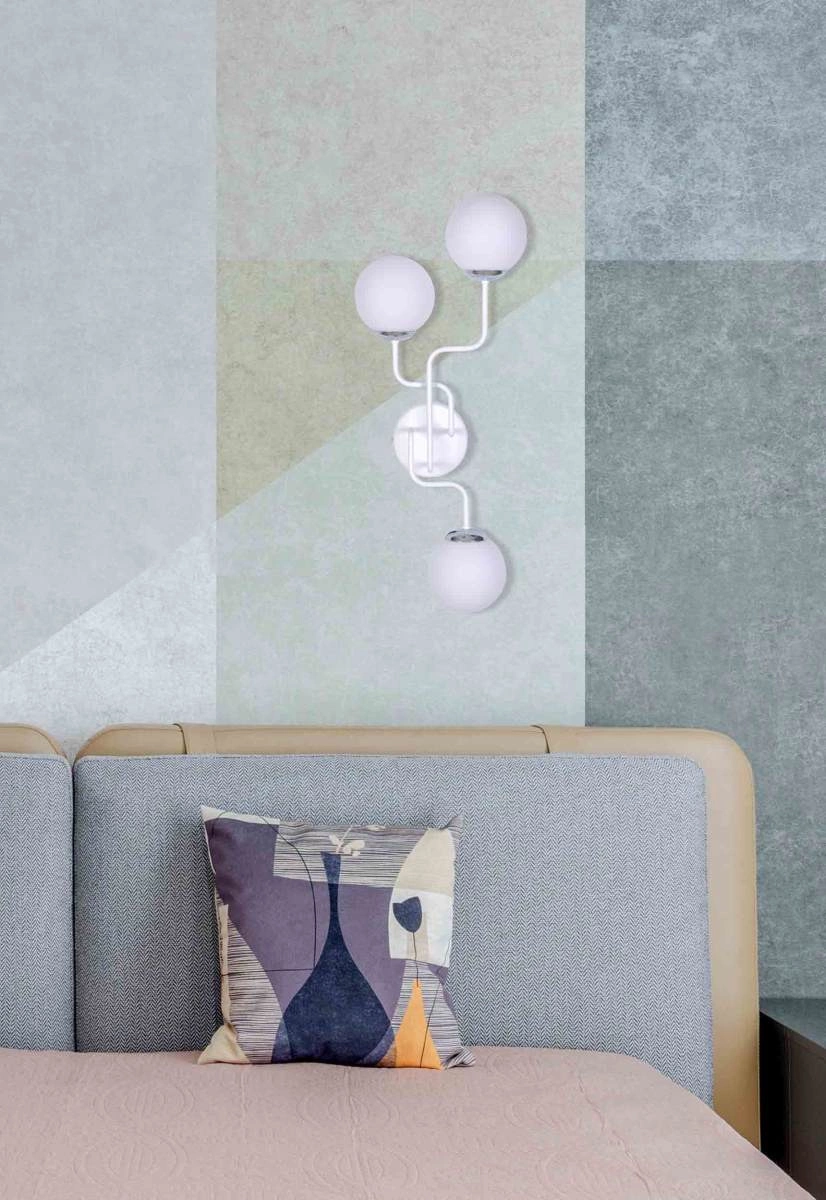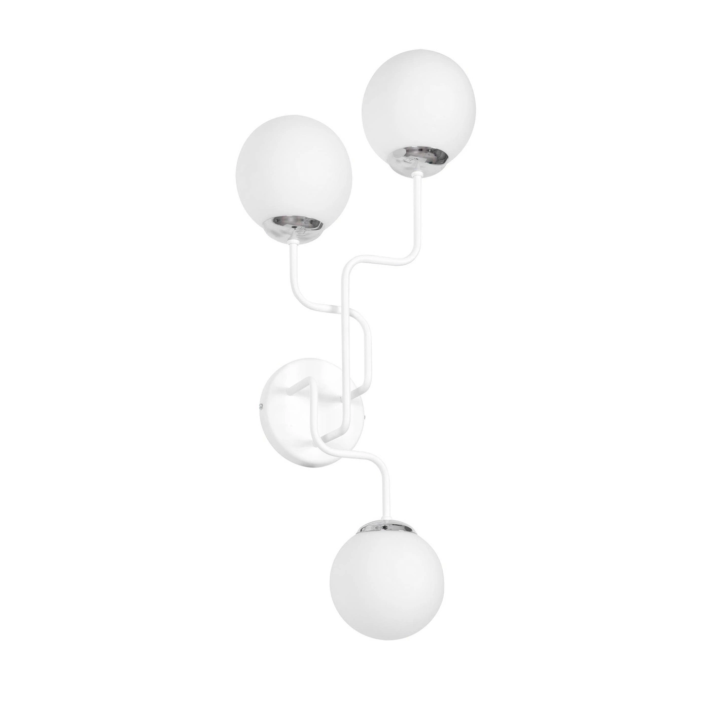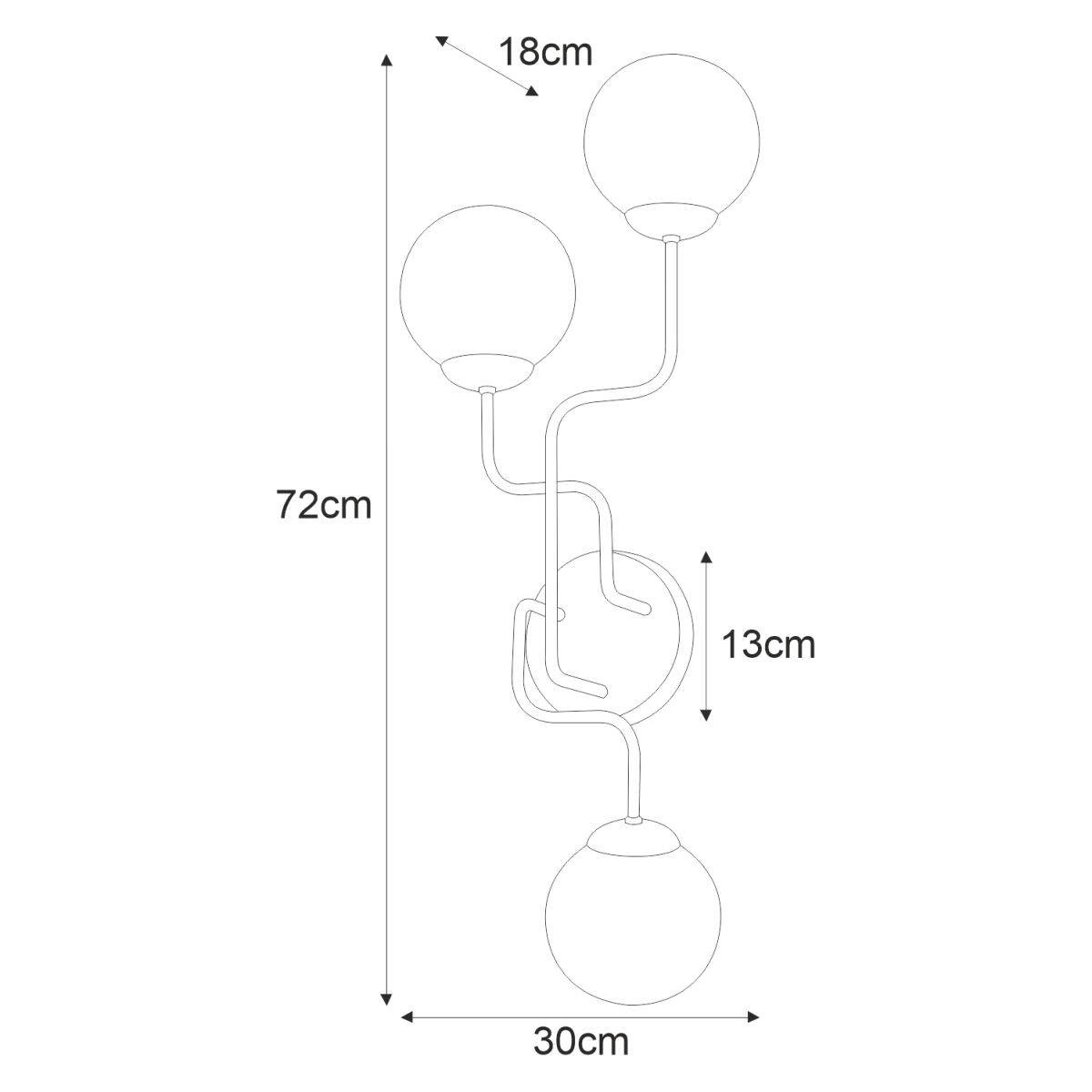 Produkt K-4058 nie przypomina typowej lampy na ścianę, jego wymiary są zdecydowanie większe od klasycznego kinkietu, a i strojnością przewyższa niejeden z nich. Wysokość lampy to aż 72 cm, natomiast szerokość - 30 cm. Od podstawy odstaje ona na 16 cm. Każdy z kloszy w lampie ma średnicę ø=14 cm. Materiały użyte do tego projektu to najwyższej jakości metal oraz mleczne szkło. Stelaż został pomalowany proszkowo na biało, natomiast elementy ozdobne przy kloszu zostały poddane procesowi galwanizacji, w wyniku którego uzyskaliśmy efekt srebrnego koloru.