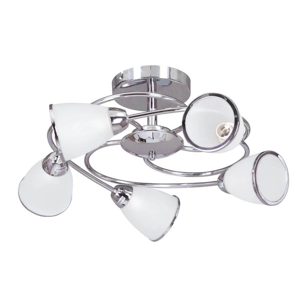 Połączenie chromu I mlecznego szkła sprawia, że model K-JSL-6059/5 CHR można śmiało nazwać uniwersalnym. Bez problemu sprawdzi się on zarówno w aranżacjach klasycznych jak i tych bez jasno określonego motywu przewodniego. Ciekawa konstrukcja z pewnością urozmaici każde wnętrze, głównie za sprawą dekoracyjnie wygiętych rurek podtrzymujących klosze. Same klosze zresztą ozdobione są pierścieniami w kolorze chromu, co sprawia, że doskonale pasują one do oprawy.