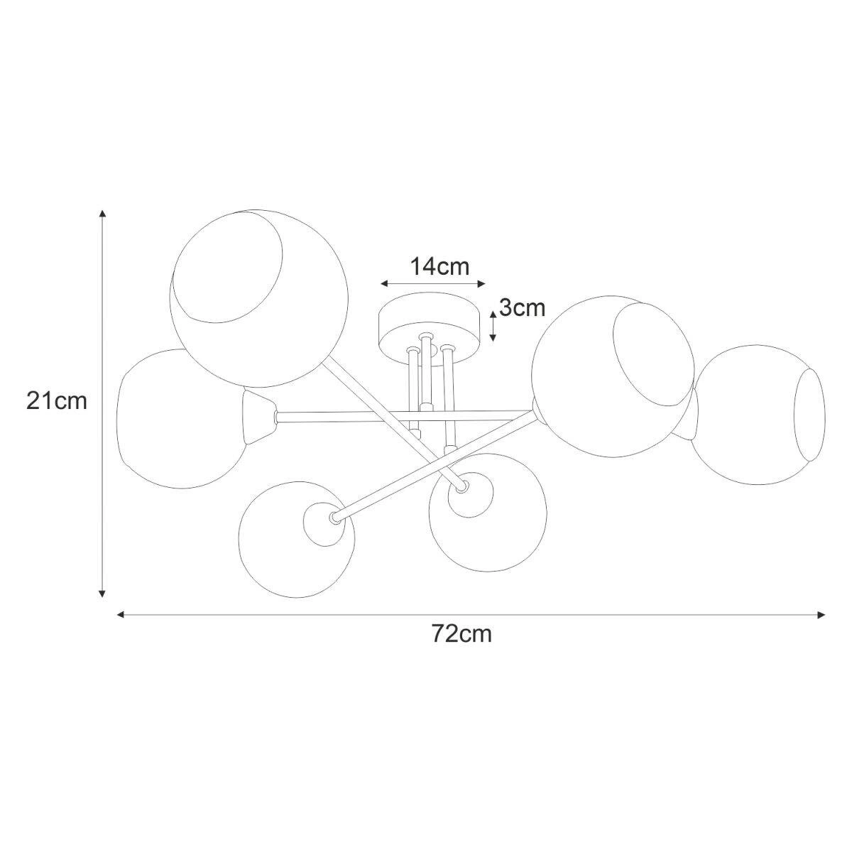 Ten produkt to średniej wielkości projekt należący do serii FONS. Jest niezwykle rozłożysta - mierzy 72 cm szerokości, ale wysokość ma niewielką - kończy się na 21 centymetrach od sufitu. To idealne rozwiązanie do dużych, ale niskich pomieszczeń. Aż sześć źródeł światła wzorowo doświetli nawet najdalszy kąt, a dzięki niedużej wysokości, lampa nie będzie przytłaczać aranżacji pomieszczenia. Punkty światła zostały umieszczone na końcach trzech przecinających się ramion. Zakończono je eleganckimi dwuwarstwowymi kloszami: wewnętrzny jest ażurowy i zachowany w kolorze chromu, natomiast zewnętrzny stworzono z przejrzystego szkła. Cała kompozycja została zachowana w chłodnej kolorystyce, co tworzy surowy, ale też niebywale elegancki i dystyngowany klimat. Produkt został wyposażony w trzonki E14. Bez problemu dopasujesz do niego odpowiadające Ci żarówki zarówno co do barwy, jak i mocy (max. 40W na jeden trzonek). Lampa została zbudowana z najlepszej jakości komponentów, masz więc pewność, że posłuży Ci na lata użytkowania. Ponadczasowe wzornictwo sprawi natomiast, że nigdy nie wyjdzie ona z mody. Taki typ oświetlenia sprawdzi się zarówno w domach czy mieszkaniach prywatnych, jak i w lokalach usługowych, restauracjach czy hotelach. Jej niestandardowa budowa nada nowego wydźwięku w Twoich wnętrzach i stworzy niepowtarzalny iluminacyjny klimat.