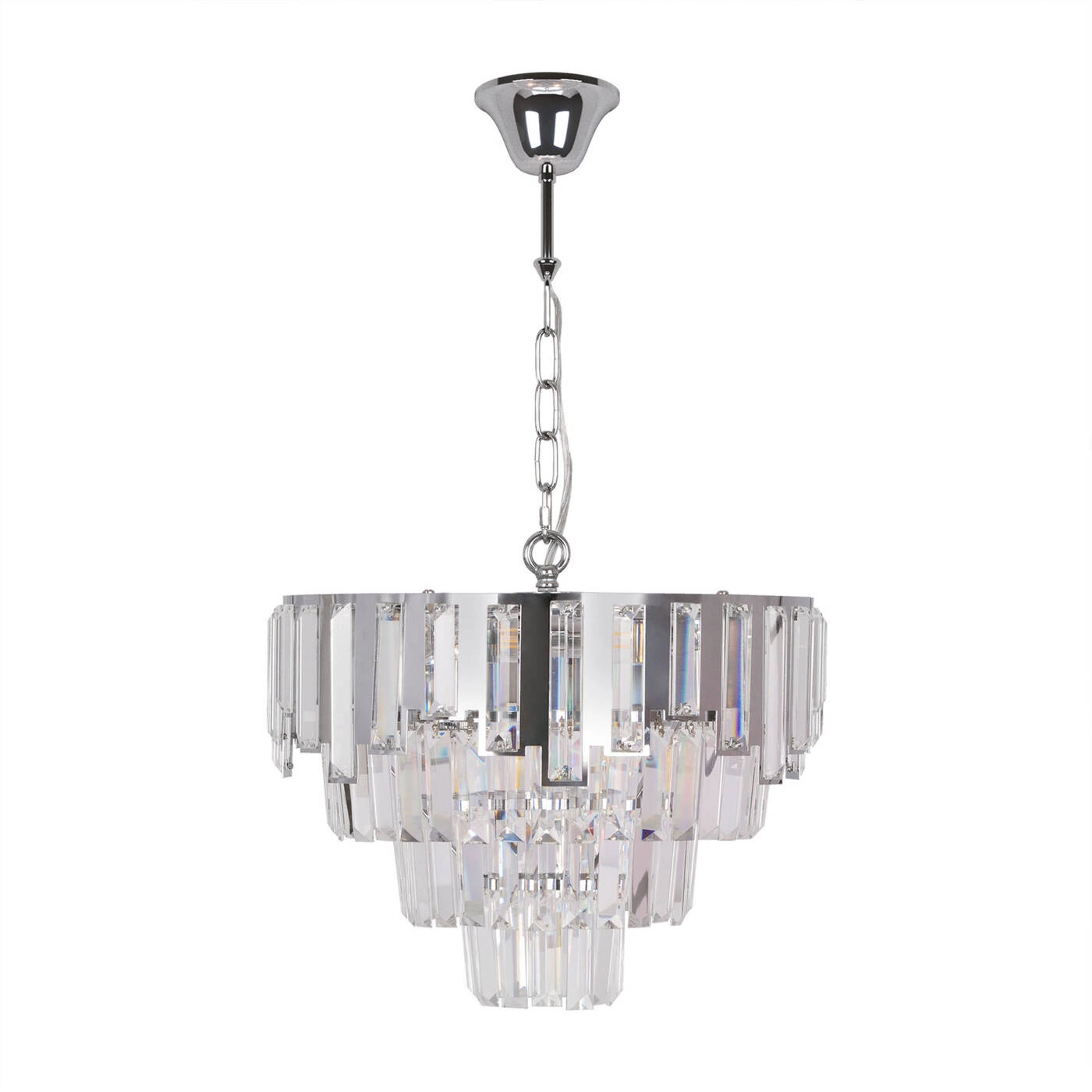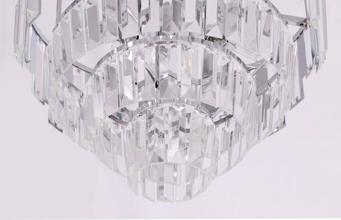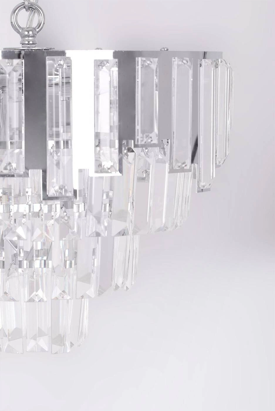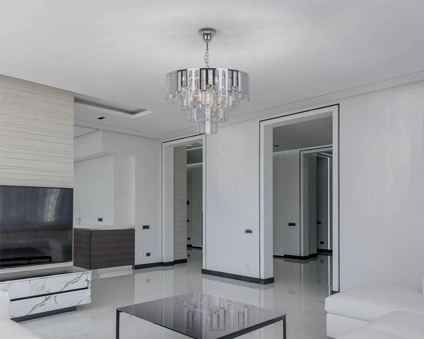 Projekt modelu K-8176 bez wątpienia przykuwa wzrok, jest on dobrze przemyślany i wykonany z najlepszej jakości materiałów, tak by zadowolić nawet najbardziej wymagających klientów. Omawiany żyrandol zawieszony jest na stylowym łańcuchu, który nie tylko zapewnia trwałe i stabilne połączenie oprawy z sufitem, ale także świetnie komponuje się z resztą projektu. Poza przezroczystymi kryształami, całość utrzymana jest w chromie, którego niemalże lustrzana powłoka doskonale podkreśla elegancką formę całego designu. Ze względu na swoją wyjątkową estetykę, żyrandol jest wręcz stworzony do eleganckich wnętrz, a w szczególności tych urządzonych w stylu glamour. Fani tej właśnie estetyki z pewnością zainteresują się również większym modelem z serii CAMERON, oraz kryształowymi żyrandolami w kolorze złotym należącymi do CAMERON GOLD.