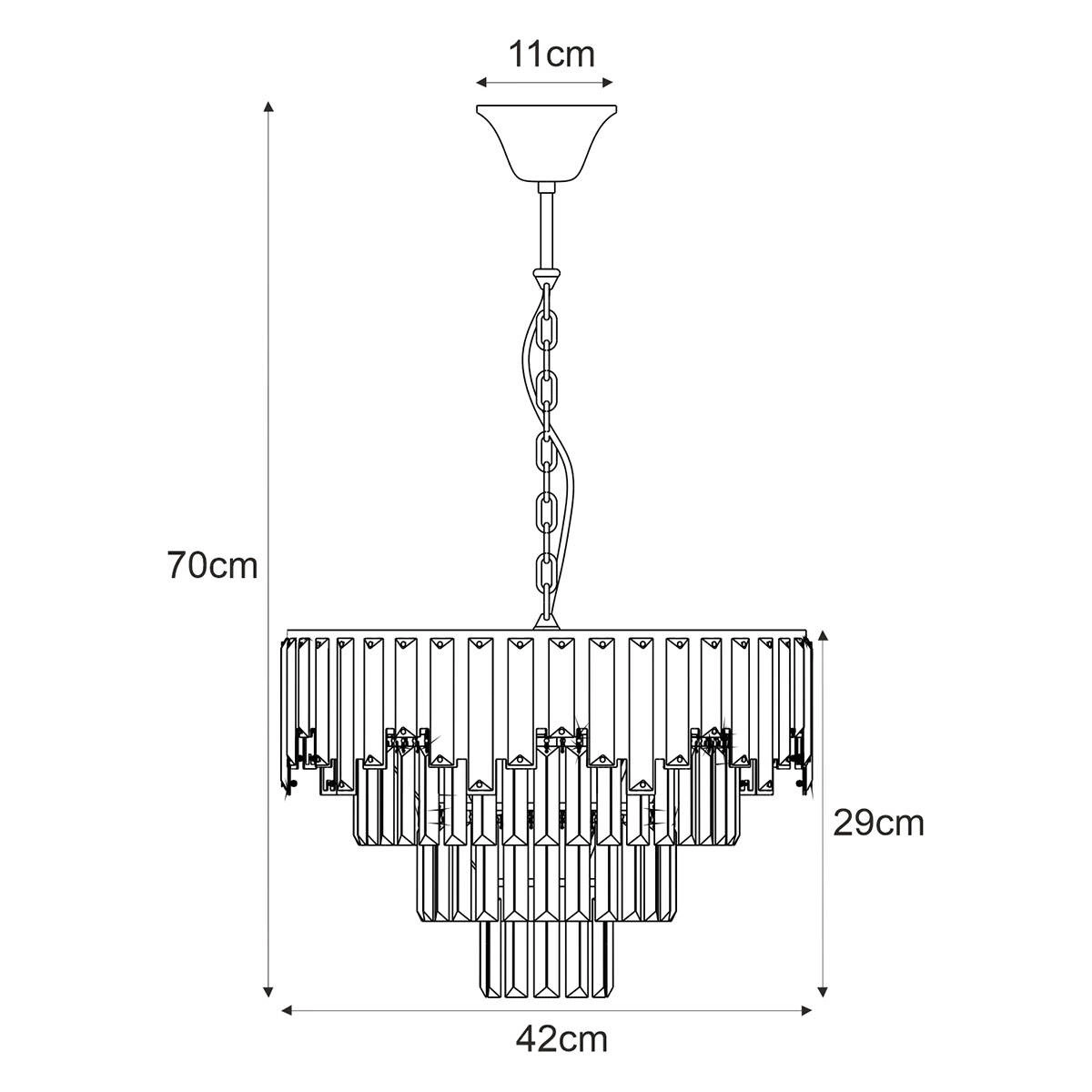 Żyrandol ma 42 centymetry średnicy i 29 centymetrów wysokości, przez co sprawdzi się również w średnich wnętrzach, nic jednak nie stoi na przeszkodzie aby zamontować kilka sztuk w przypadku dużych pomieszczeń. Niezależnie jednak od powierzchni w jakiej się znajdzie, K-8176 za sprawą sześciu żarówek na mocowanie E14, doskonale rozświetli każdy kąt. Tym bardziej, że źródła światła można podzielić na dwa włączniki w układzie 3+3, co pozwoli na lepsze dopasowanie atmosfery pomieszczenia do swoich potrzeb. Warto również zaznaczyć, że za sprawą wspomnianego wcześniej łańcucha, długość zwisu może być regulowana, a klosz może znaleźć się maksymalnie 70 centymetrów od sufitu.
