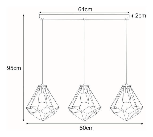 Klosze lampy zespawano ze sobą z najwyższą dokładnością z wysokiej jakości metalowych prętów. Stworzono je na wzór oszlifowanych diamentów, gdzie każdy pręt to krawędź przestrzennej bryły. Abażury są ażurowe, nie posiadają wypełnienia i nie osłaniają punktów światła, dzięki czemu będzie ono padać nietłumione na pomieszczenie i dobrze doświetli każdy kąt.