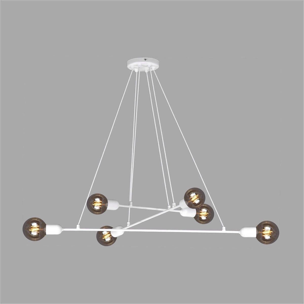 Ten nowoczesny żyrandol posiada aż sześć źródła światła skierowanych w przeciwnych do siebie kierunkach. Światło, które się z nich wydobywa pada pod kątem prostym na ściany pomieszczenia.