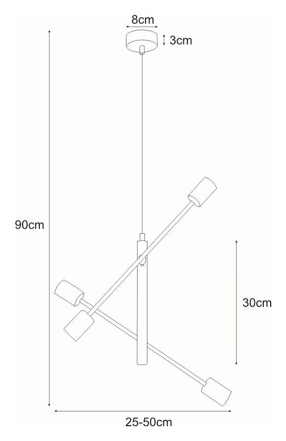 Produkt K-4750 to dwa pręty umieszczone poprzecznie do trzonu, umiejscowione na przegubach, dzięki którym możemy regulować ich położenie. W takim przypadku szerokość bryły będzie się wahać od 25 do 50 cm, w zależności pod jakim kątem ustawimy punkty światła. Całość wychodzi z okrągłej, niedużej podsufitki na regulowanym przewodzie, zatem maksymalna długość zwisu wynosi 90 cm.