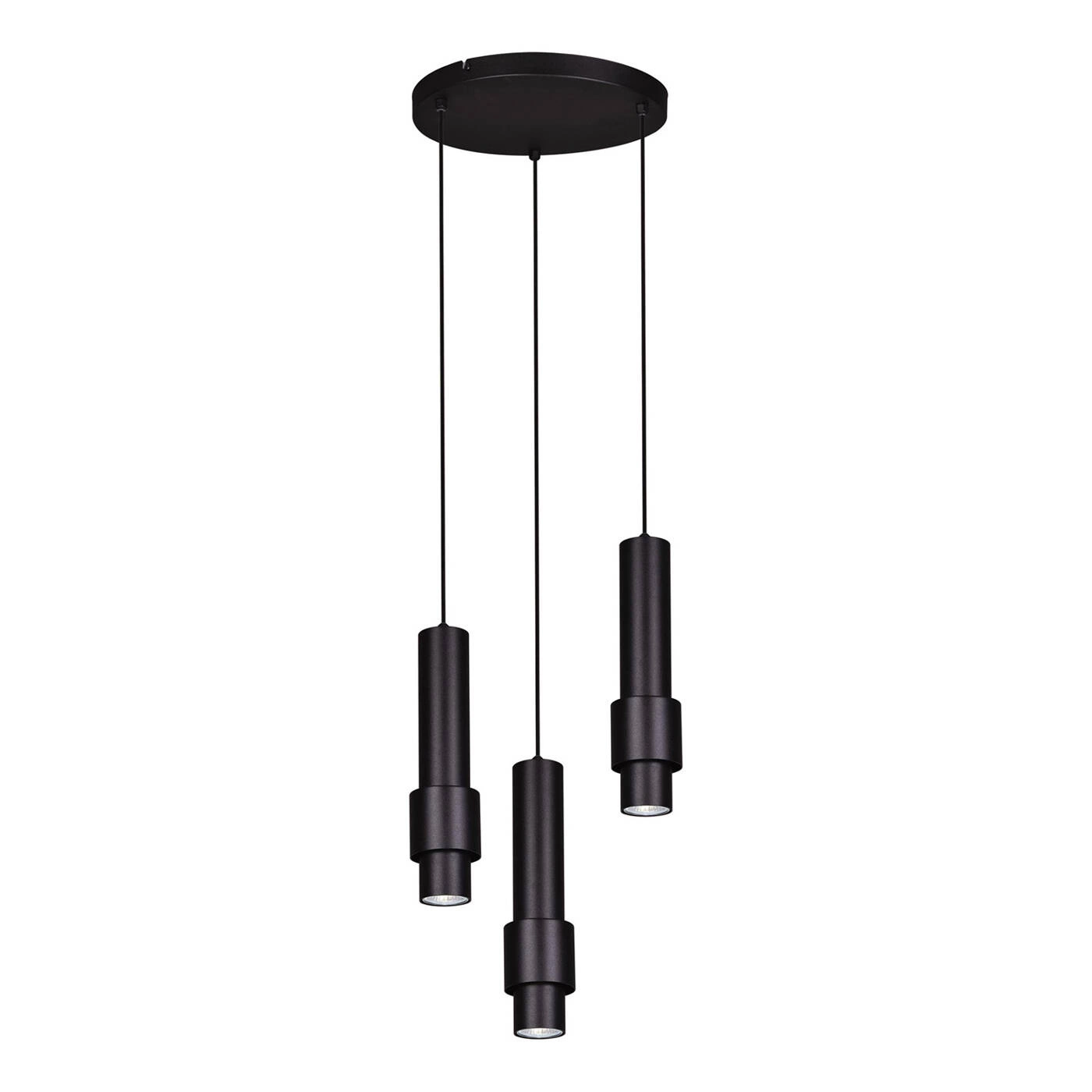 Trzy punkty światła zostały umieszczone na regulowanych przewodach wychodzących z okrągłej podsufitki. Umieszczono je w regularnych odstępach od siebie, na planie trójkąta równobocznego wpisanego w koło. Klosze uformowano z najlepszej jakości metalu na kształt walców o średnicy 8 cm i wysokości 31 cm. W swojej dolnej części posiadają elegancki, szerszy pierścień w tym samym kolorze. Możliwość zmiany wysokości zawieszenia elementów daje nam wiele perspektyw kompozycyjnych. Możemy zostawić je na tej samej płaszczyźnie poziomej, lub, na przykład, ustawić schodkowo.
