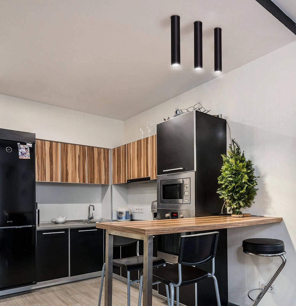Lampa sufitowa K-4406 to prostota w najczystszej formie, sprowadzająca się do czarnej tuby o wymiarach 30cm długości na 5,5cm szerokości. Jest to rodzaj oświetlenia punktowego, wyposażony w mocowanie na żarówkę GU10. Niewielkie wymiary lamp umożliwiają dowolne ich rozłożenie na przestrzeni sufitu wedle uznania. Mogą one tworzyć symetryczne pary, lub nieregularne grupy. Pojedyncze lampy mogą służyć oświetleniu wybranych mebli lub części pomieszczenia co dodatkowo skupi na nich uwagę gości i domowników. Sama oprawa jest nieinwazyjna i z pewnością nie będzie odciągać uwagi od oświetlanych przez nią elementów wyposażenia.