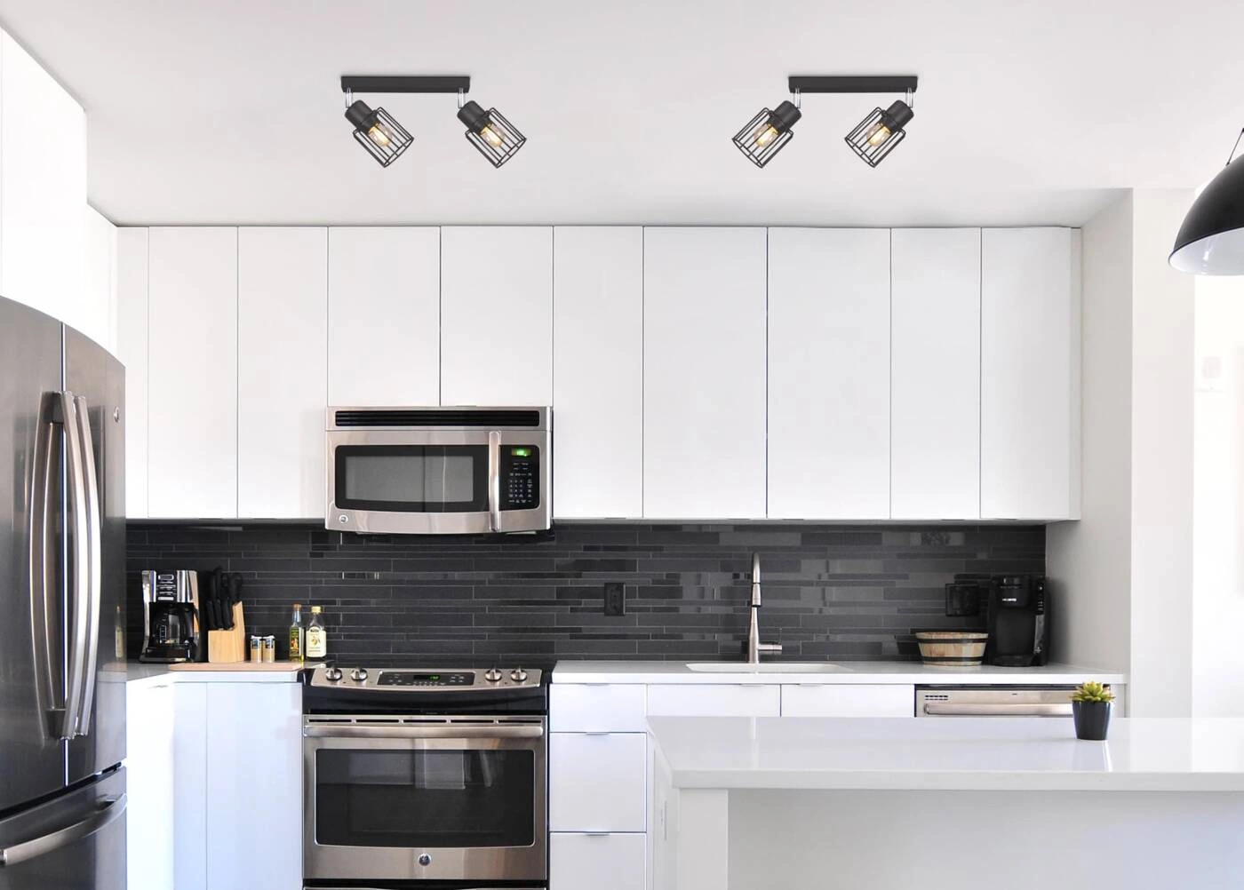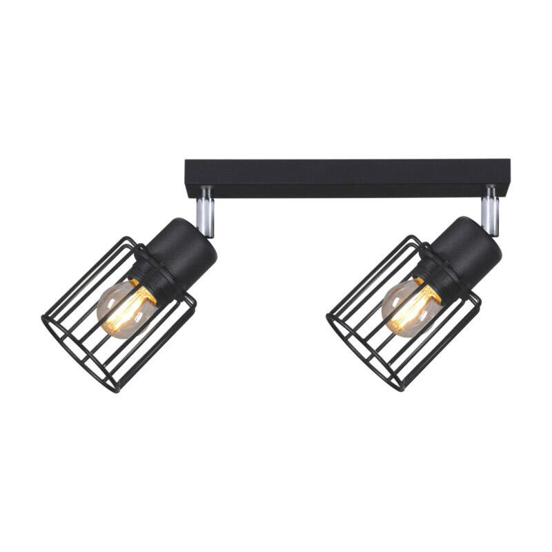 Dwa punkty światła umieszczono tutaj na podłużnej podsufitce, która maskuje kable, będąc jednocześnie elementem konstrukcyjno-dekoracyjnym. Trzonki o typie E27 umieszczono na regulowanych przegubach i osłonięto kloszami z czarnych prętów. Całość zachowana w kolorze matowej czerni (jedynie z przegubami w kolorze chromu) nawiązuje do stylu loft oraz industrial.