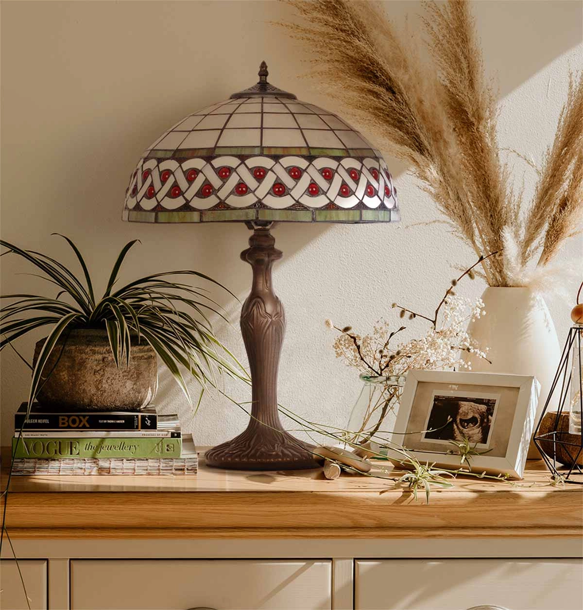 Lampka stołowa K-G162208 to świetne rozwiązanie dla każdego wielbiciela luksusowego oświetlenia. Model, inspirowany kultowymi lampami Tiffany, z witrażowym kloszem, czyli z kawałkami kolorowego szkła, ułożonymi we wzór. Podstawa wykonana z metalu, przypomina klasyczne, wykonane z brązu. Lampa w stylu Art. Deco, będzie współgrało z wnętrzem zachowanym w nurcie vintage, w którym spotkamy przedmioty o „starym” wyglądzie, z duszą. Można także umieścić je w salonie czy innym pomieszczeniu w stylu rustykalnym. Lampka będzie doskonale się prezentowała w restauracjach urządzonych w takim klimacie.