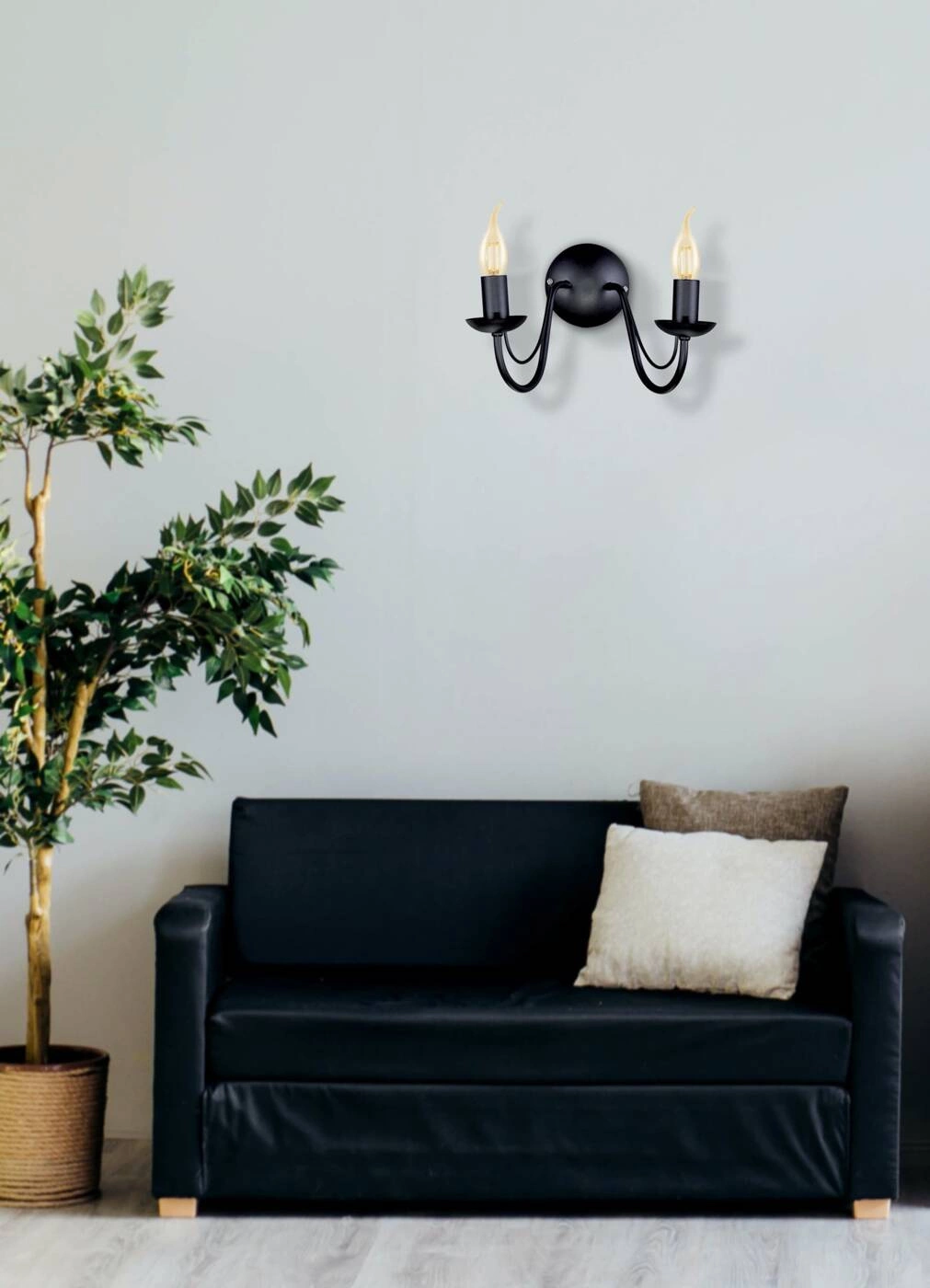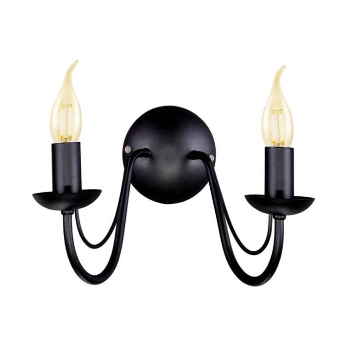Kinkiet K-3994 to dwa źródła światła zamieszczone w taki sposób, aby nawet jak na kinkiet oświetlały jak największą przestrzeń. Czarna, metalowa konstrukcja została wykonana z najwyższą starannością przez nasz zespół w Łyskach, k. Białegostoku. W tym modelu zastosowano oprawki na gwint E14. Jest to bardzo popularny gwint, zatem dobór adekwatnego źródła stawia sporo opcji. Maksymalna moc jednej żarówki to 60 W. Wybierz odpowiednią barwę światła, według przeznaczenia, jeśli chcesz, żeby lampa tworzyła klimatyczny nastrój, zdecyduj się na ciepłą barwę światła. Natomiast barwę neutralną wybierz, jeśli chcesz, żeby oświetlenie było jak najbardziej zbliżone do oświetlenia dziennego. Najbardziej polecanymi do tego modelu będą żarówki płomykowe, przedstawione na zdjęciu (w celach poglądowych, nie są one dołączone w zestawie), bądź inna w kształcie świeczki.