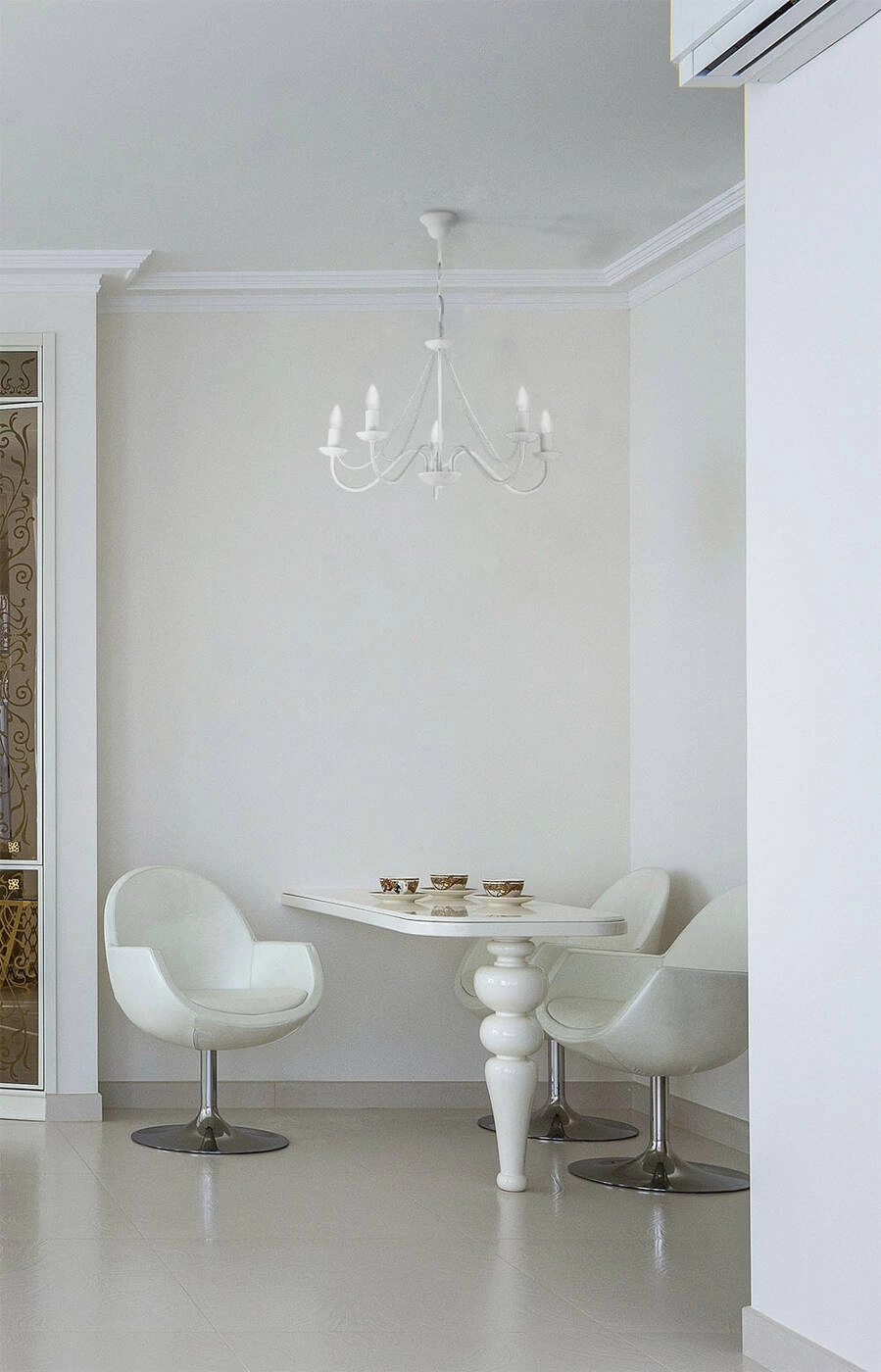 Lampa wisząca K-3996 w stylu klasycznym z pięcioma źródłami światła, w niezwykle uniwersalnym kolorze bieli. Lampa idealnie nada się do eleganckiego czy minimalistycznego salonu, a także do miejsc użytku publicznego, takich jak restauracje. Uniwersalność tej lampy podkreśla fakt, że ma regulowaną wysokość. Tradycyjna lampa sufitowa została zaprojektowana w kształcie klasycznego świecznika. Żyrandol został wyposażony w oprawki z gwintem E14, czyli małym gwintem. Do tej lampy polecamy żarówki typu świeczki, zwłaszcza z zakręconym czubkiem, co sprawi, że cała oprawa będzie wyglądała na bardziej dekoracyjną.