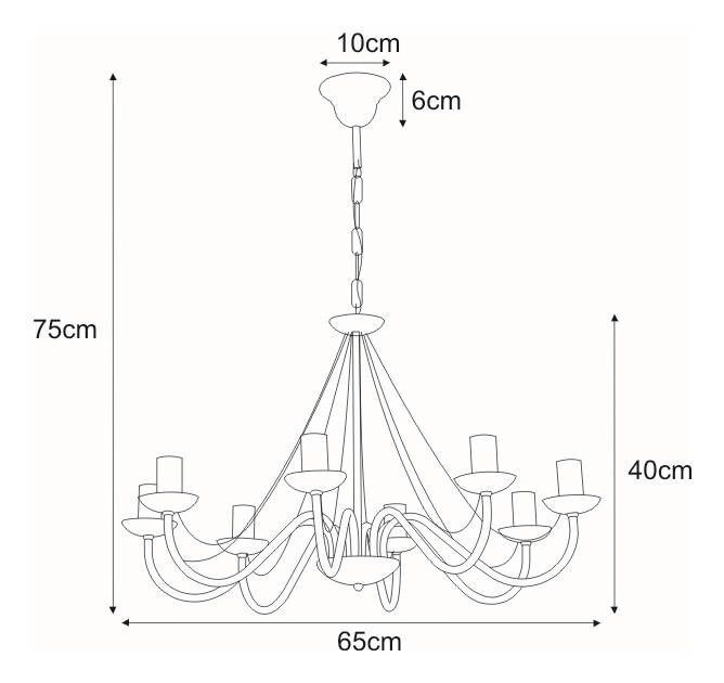 Każde z dekoracyjnie wygiętych ramion zostało zwieńczone miejscem na żarówkę o tak zwanym małym gwincie E14. Całokształt lampy przypomina świecznik. By wzmocnić ten efekt, pod każdą oprawką na żarówkę zamocowano okrągłą podstawkę, która w prawdziwym świeczniku odpowiadałaby za wyłapywanie spływającego wosku. Aby jeszcze bardziej wyeksponować nietuzinkową formę żyrandola, zachęcamy do zastosowania żarówek w kształcie płomyków. Aż osiem źródeł światła pozwala na oświetlenie dużej przestrzeni. Aby nie włączać za każdym razem wszystkich żarówek, lampa posiada możliwość podziału na dwa włączniki w systemie 4+4. Jest to idealne rozwiązanie zwłaszcza podczas wieczornego relaksu, kiedy nie potrzebujemy aż tak dużego oświetlenia.