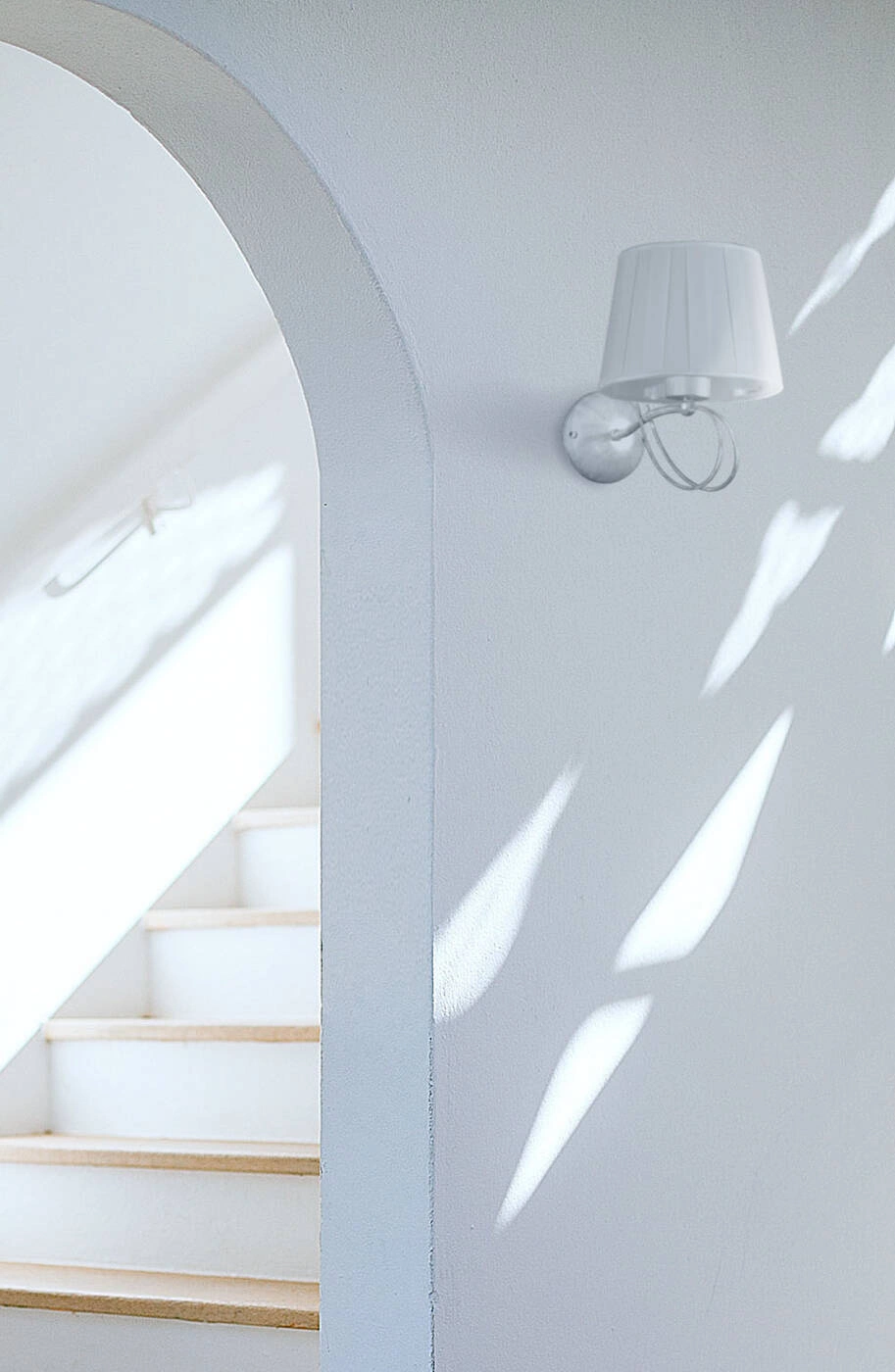 Delikatnie zdobione, srebrne ramię zostało zwieńczone białym abażurem. Całość tworzy elegancką i ponadczasową kompozycję, która idealnie wpasuje się we wnętrza w stylu glamour, ale również te bardziej nowoczesne, jak np. skandynawskie. Połączenie uniwersalnej kolorystyki i delikatnej formy sprawia, że ten kinkiet stanowi nie tylko dodatkowe źródło światła, ale także stylową dekorację. Dzięki temu wyjątkowo pięknie będzie się prezentował zawieszony nad łóżkiem w sypialni czy też w holu między obrazami.
