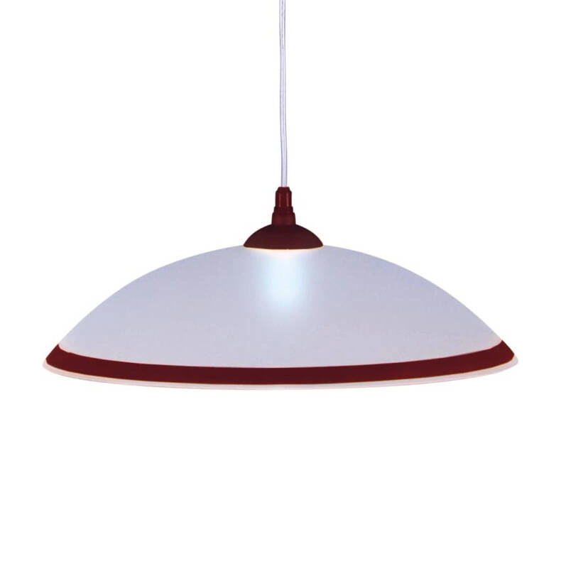 Lampa wisząca K-3511 to propozycja do wnętrz w Twoim domu, świetnie sprawdzi się w pokoju dziecięcym ze względu na barwne elementy, w tym przypadku kolor bordowy. Umieszczony w miejscu łączenia przewodu z kloszem oraz na najszerszej jego części. W rodzinie lamp UFO znajdziesz do wyboru także inne wersje kolorystyczne: granatowy, żółty, zielony, czerwony oraz klasyczny biały. W związku z tym lampa wisząca może z powodzeniem znaleźć się w kuchni czy salonie. Szeroki, mleczny klosz jest wykonany z półprzezroczystego, matowego szkła, dzięki czemu dobrze rozprasza światło, które dociera w każdy zakamarek naszego pomieszczenia. Średnica klosza wynosi aż 40 cm.