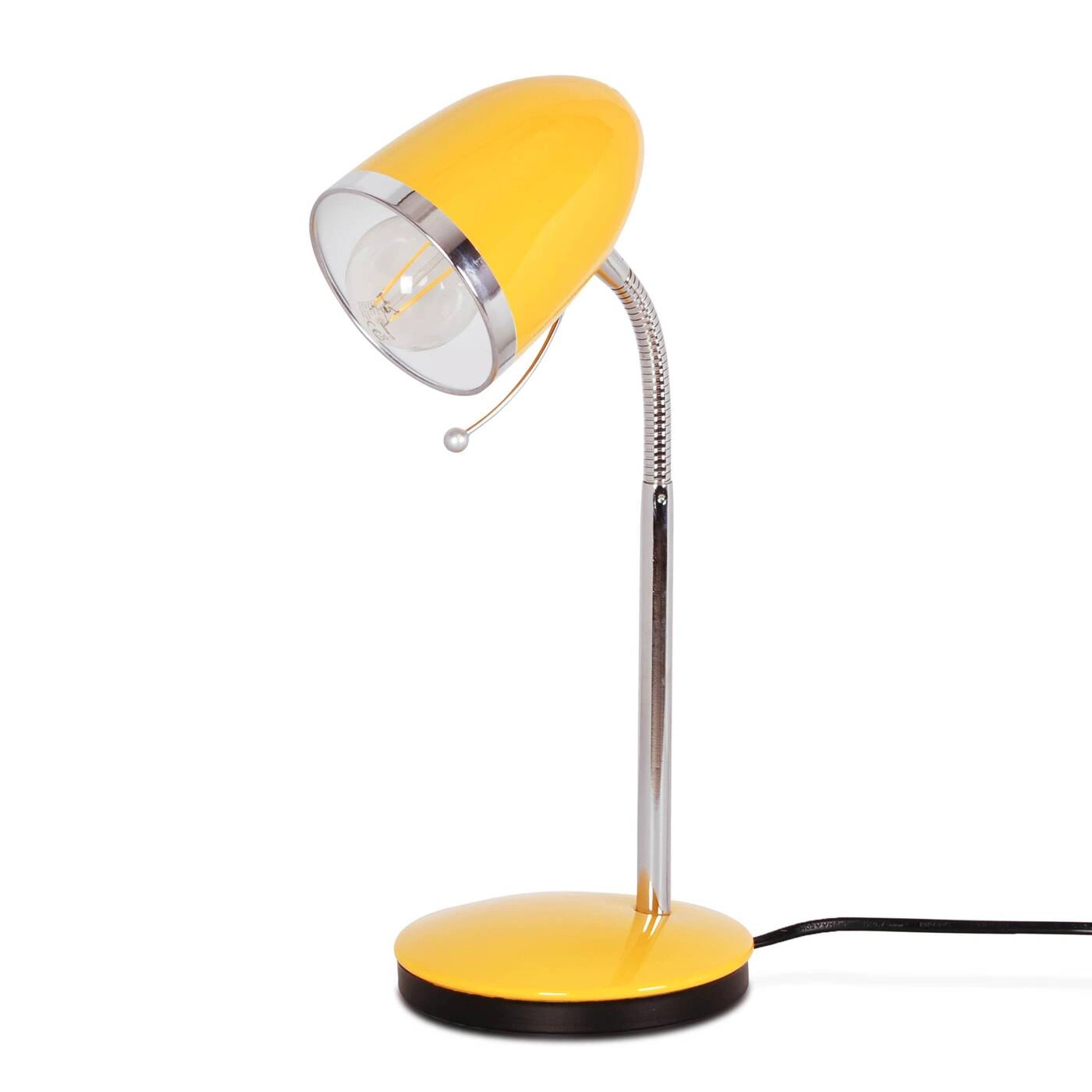 Lampka biurkowa w energetyzującym żółtym kolorze to nasza propozycja oświetlenia dla maluchów i do pokoju nastolatków. Składa się z barwnej podstawy i klosza oraz chromowanego ramienia i otoczki na końcu klosza. Ramię jest elastyczne i pozwala na regulację kąta świecenia. Do głowicy przymocowany jest pręt, dzięki któremu można kierunkować lampę, bez chwytania za klosz. Włącznik został umieszczony na przewodzie. Solidna, metalowa lampka posłuży Ci na wiele lat.