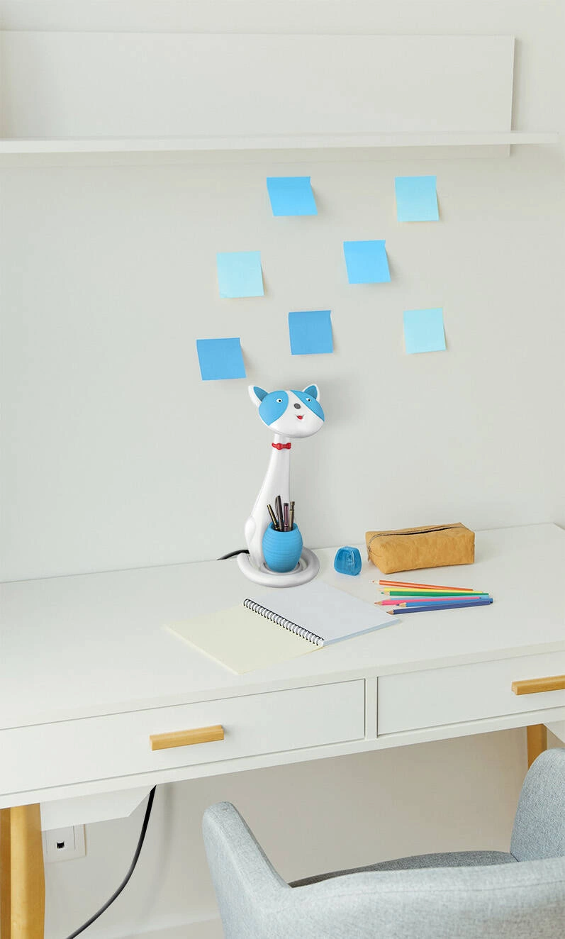 Najpraktyczniejszą opcją lampki jest pojemnik na przybory szkolne, który pomaga zachować porządek na biurku- łatwy dostęp do długopisów, mazaków, kredek i ołówków, które przestaną się gubić w plątaninie świeżo namalowanych arcydzieł młodych artystów lub między zeszytami pilnych uczniów! Dodatkowo pod pojemnikiem zamontowane zostało oświetlenie nocne LED. Zamontowany dotykowy włącznik został umiejscowiony w taki sposób, aby wyglądał jak nieodłączny element lampki. Dotykając jednego oka służącego jako włącznik jesteśmy w stanie ściemnić aż dwukrotnie źródło światła, oczywiście z możliwością powrotu do poprzedniego stanu. Drugie oko Kotka nie tylko włącza oświetlenie nocne znajdujące się pod pojemnikiem na przybory, ale także uruchamia tryb zmiany barwy światła!