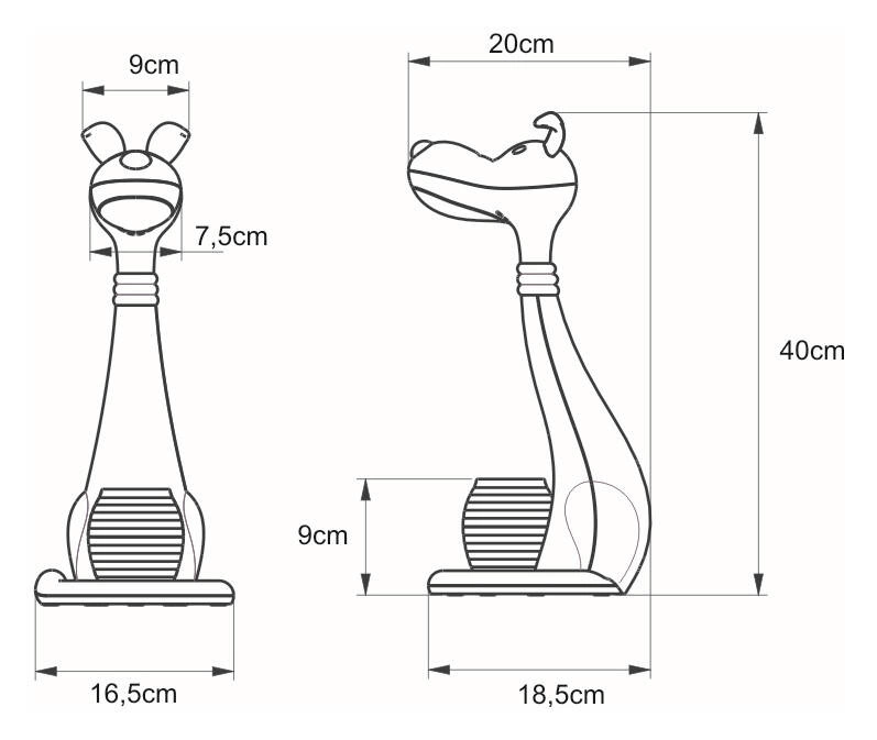 Najpraktyczniejszą opcją lampki jest pojemnik na przybory szkolne, który pomaga zachować porządek na biurku- łatwy dostęp do długopisów, mazaków, kredek i ołówków, które przestaną się gubić w plątaninie świeżo namalowanych arcydzieł młodych artystów lub między zeszytami pilnych uczniów! Dodatkowo pod pojemnikiem zamontowane zostało oświetlenie nocne LED. Zamontowany dotykowy włącznik został umiejscowiony w taki sposób, aby wyglądał jak nieodłączny element lampki. Dotykając jednego oka służącego jako włącznik jesteśmy w stanie ściemnić aż dwukrotnie źródło światła, oczywiście z możliwością powrotu do poprzedniego stanu. Drugie oko Pieska nie tylko włącza oświetlenie nocne znajdujące się pod pojemnikiem na przybory, ale także uruchamia tryb zmiany barwy światła!