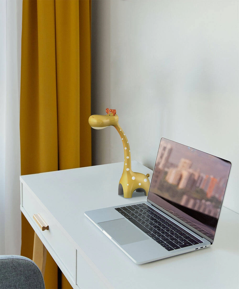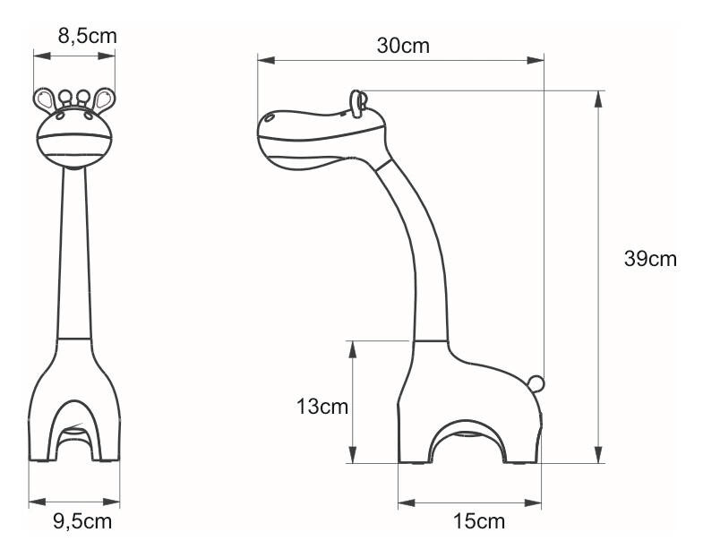 Elastyczne ramię lampki zaczynające się pod główką a kończące przy tułowiu żyrafy umożliwia ustawienie źródła światła w sposób najbardziej odpowiadający naszym potrzebom. Lampka posiada także 2 źródła światła. Jedno z nich sprytnie zostało zamontowane pod pyszczkiem żyrafy, natomiast drugie pod łapkami. Brzuszek lampki jest dodatkowym źródłem światła, dzięki czemu przed snem może nam służyć jako oświetlenie nocne.