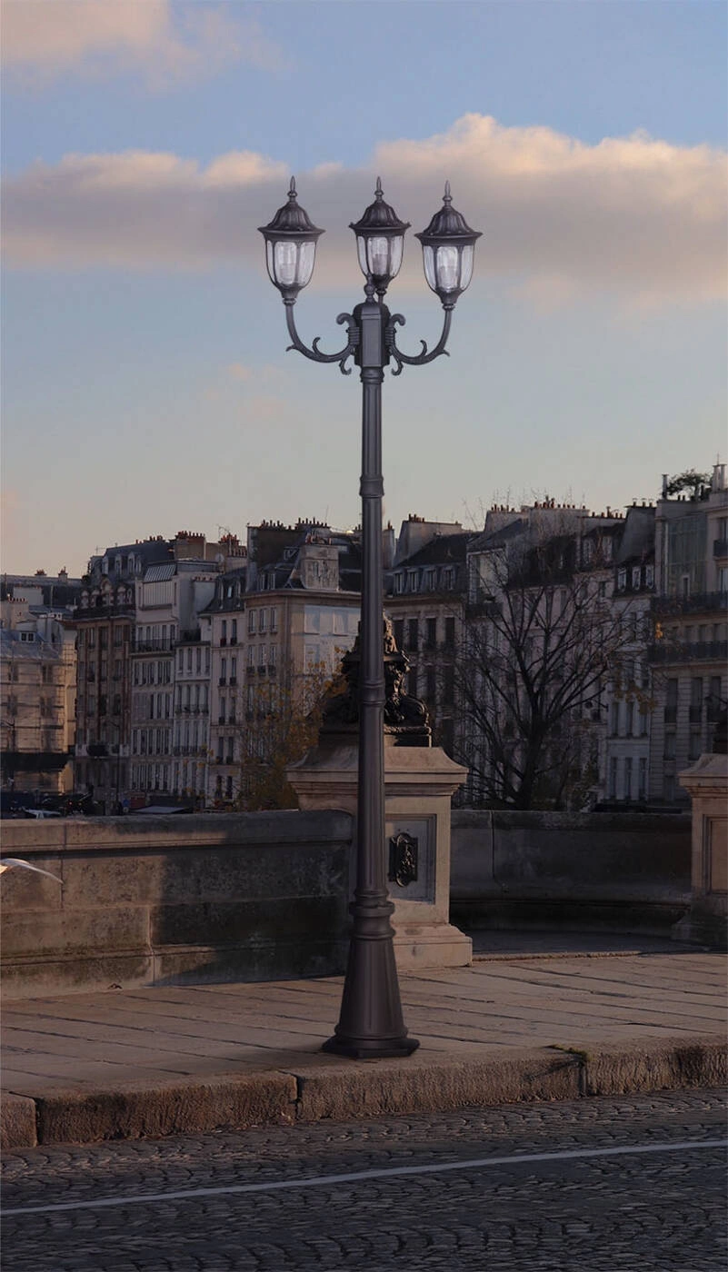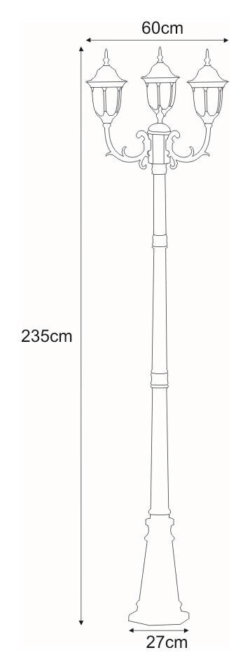 Lampa ma aż 235 centymetrów wysokości, przez co jest w stanie oświetlić spory obszar, może ona zatem z powodzeniem występować pojedynczo w mniejszych ogrodach. Spore gabaryty pozwolą na zastosowanie modelu K-7007A2/3N również w gęsto zarośniętym ogrodzie, gdzie światło nie przepadnie zdominowane przez zieleń. Poza tym, okazałe lampy mogą stanowić dekorację ogrodu, stojąc w dobrze widocznym miejscu, na przykład wzdłuż ścieżki lub podjazdu. W tym konkretnym przypadku, trzy klosze umieszczone na zdobionych ramionach z pewnością urozmaicą każdy teren, tym bardziej, że noga na której się znajdują, jest równie okazała. Całość utrzymana jest w czarnym kolorze i nawiązuje stylistycznie do latarni gazowych, co bez wątpienia doda uroku każdej przestrzeni.