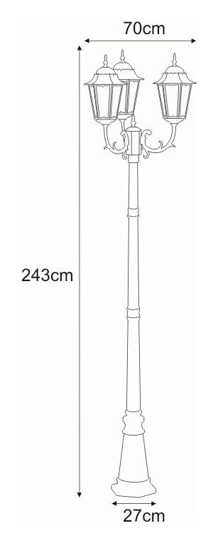 K-7006A2/3 to okazała zewnętrzna lampa stojąca, która ma aż 243 centymetry wysokości. Spore gabaryty modelu z pewnością sprawią, że odnajdzie się on w dużych ogrodach, gdzie doskonale podkreśli przestrzeń. Nic jednak nie stoi na przeszkodzie aby omawiana lampa znalazła się na mniejszych posesjach, mogłaby wtedy posłużyć jako punkt centralny całej aranżacji, zastępując pomniejsze źródła światła. Wymiary jednak nie są jedynym wartym uwagi aspektem w przypadku K-7006A2/3, gdyż wzrok przykuwa tutaj również design. Cały projekt wzorowany jest na klasycznych latarniach miejskich, po których omawiany model odziedziczył zdobienia, kształt kloszy a także charakterystyczna nogę.