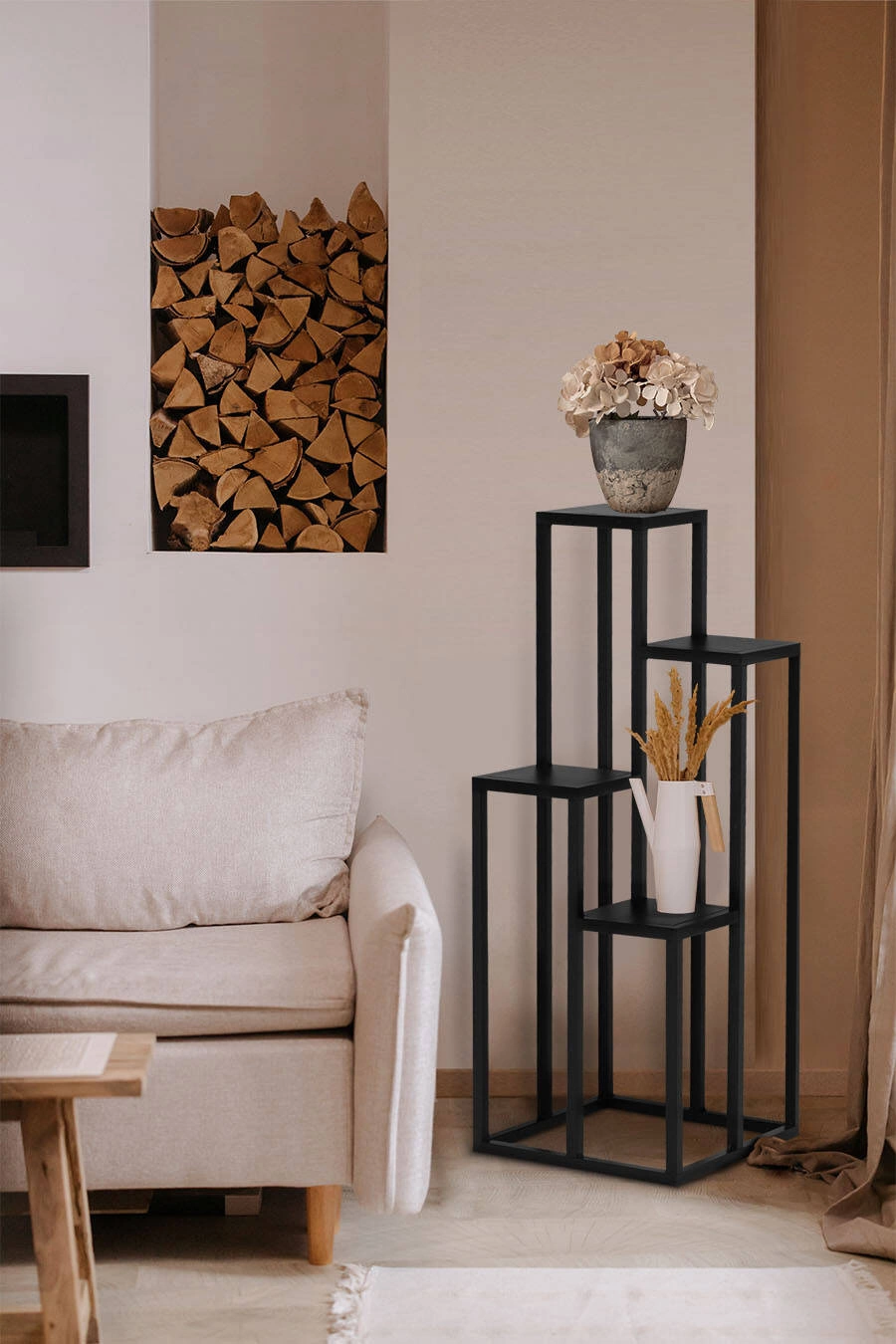 Czteropiętrowy stojak KS-04, który pozwala na ustawienie wyjątkowej kompozycji kwiatów, jest spełnieniem marzeń każdego wielbiciela roślinności. Dzięki wysokości aż 100cm możesz postawić na nim wiszące roślinki, bez obaw o dotykanie ich liści o podłogę. Czterostopniowe podstawki pozwalają na ustawienie kwiatów o różnych wysokościach, tak by nie zakrywały siebie nawzajem. Dzięki temu każdy z nich będzie widoczny. Otwarta podstawa pozwala na postawienie dodatkowych roślin na ziemi, by stworzyć imitację wzgórza pełnego roślinności. Może pnące gałązki będą pięknie okalały czarne profile? - To od Ciebie zależy ostateczny wygląd tego kwietnika!
