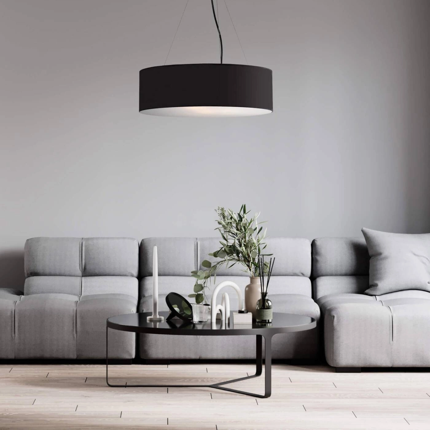 Delos wisząca czarna - jest to dość duża lampa z eleganckim i gustownym kloszem. Klosz ten wykonany jest z materiału, a od spodu połączony jest akrylem. Całość jest na dość długim przewodzie, który w razie potrzeby, można regulować. Klasyczna ale stylowa lampa, to produkt idealny dla prostych salonów i pokoi. Stonowany, czarny kolor sprawi, że uspokoi Twoje wnętrze jeśli jest np. zbyt kolorowe. Z drugiej strony, może być idealną dekoracją dla wystroju black & white. Oświetlenie to, ma dwa źródła światła, przystosowane do żarówki E27. Doskonale sprawdzi się również, w gabinetach i biurach. Lampa ta, występuje także w białej wersji kolorystycznej. Podpowiadamy także, że istnieje wzbogacona inna seria lamp, podobnych do Delos. Zapraszamy zatem, do zapoznania się z całym Naszym asortymentem!!